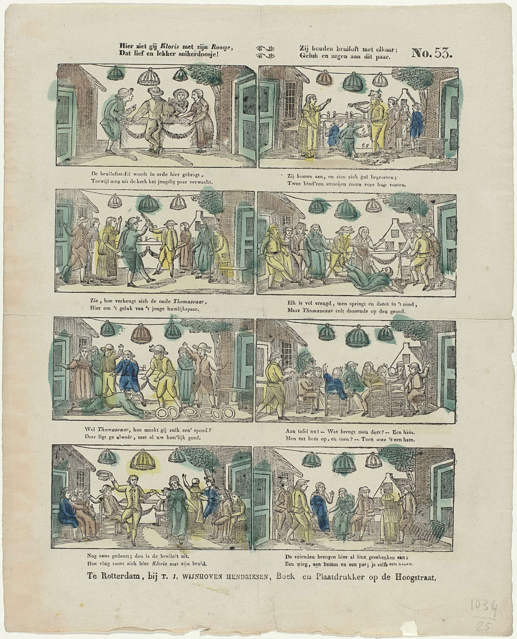 Blad met 8 voorstellingen over de bruiloft van Kloris en Roosje. Onder elke afbeelding een tweeregelig vers. Genummerd rechtsboven: No. 53.