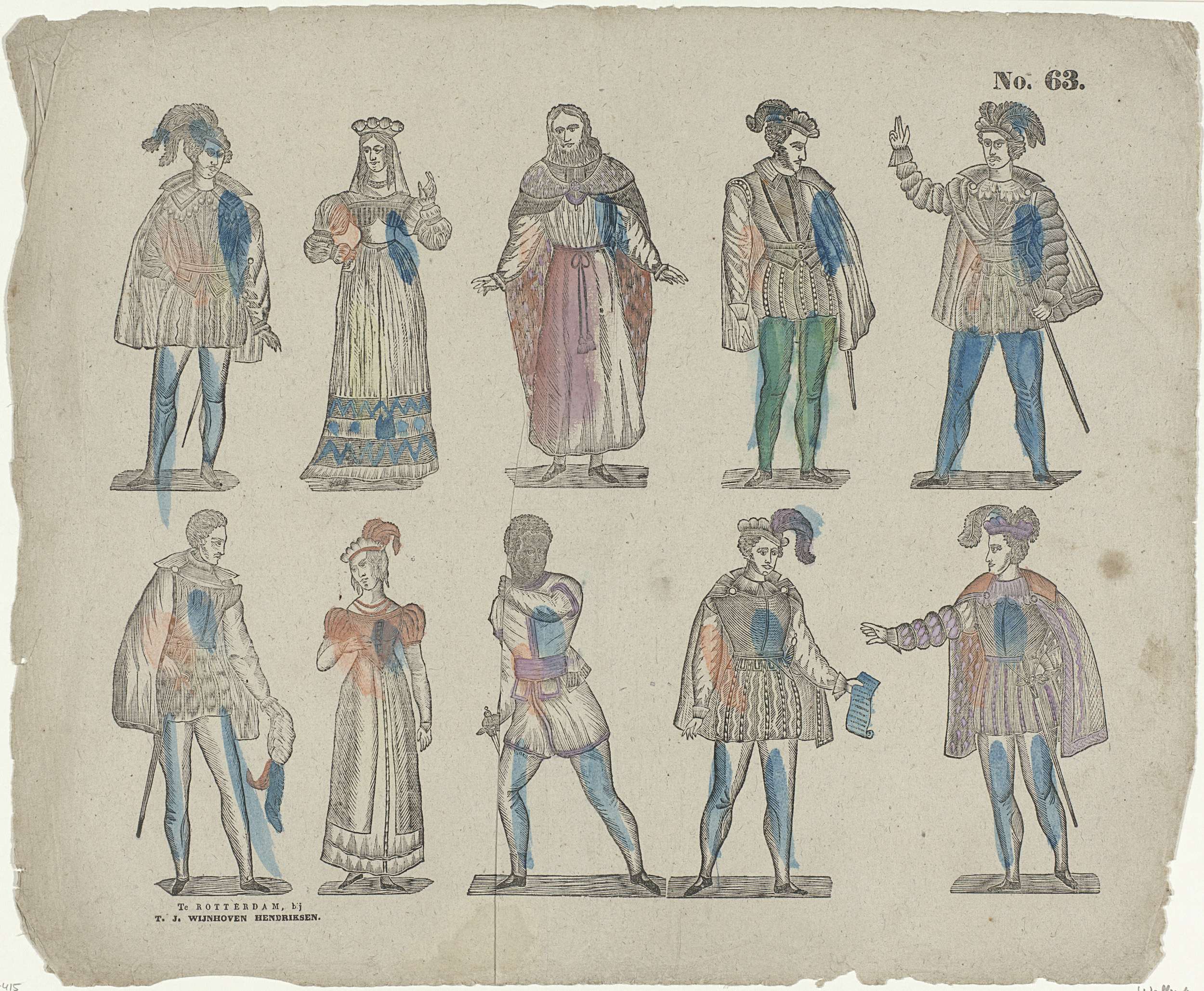Blad met 10 voorstellingen van mannen en vrouwen in historische kledij. Genummerd rechtsboven: No. 63.