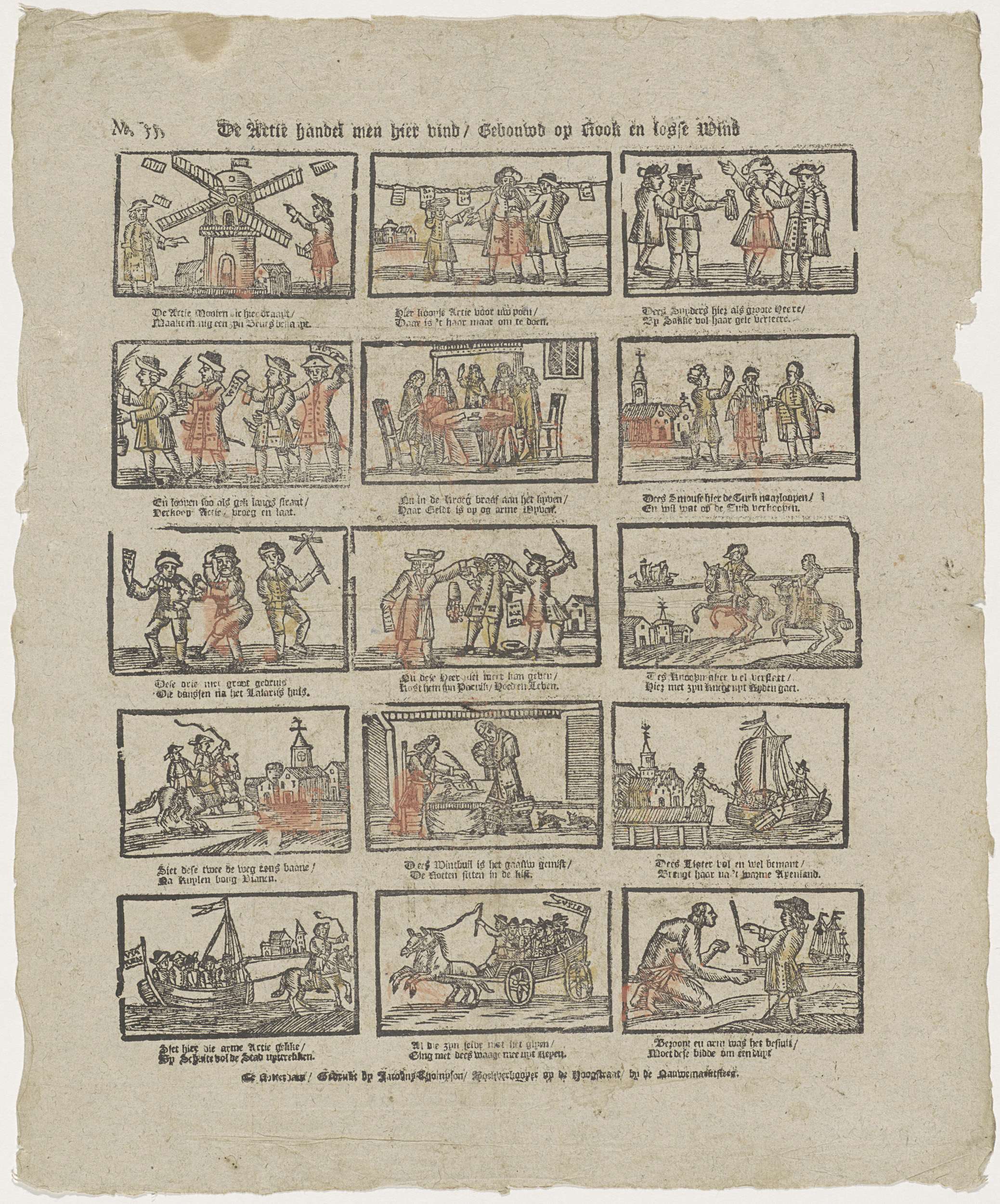 Blad met 15 voorstellingen over handel in aandelen (acties). Onder elke voorstelling een tweeregelig vers. Genummerd linksboven: No. 55.