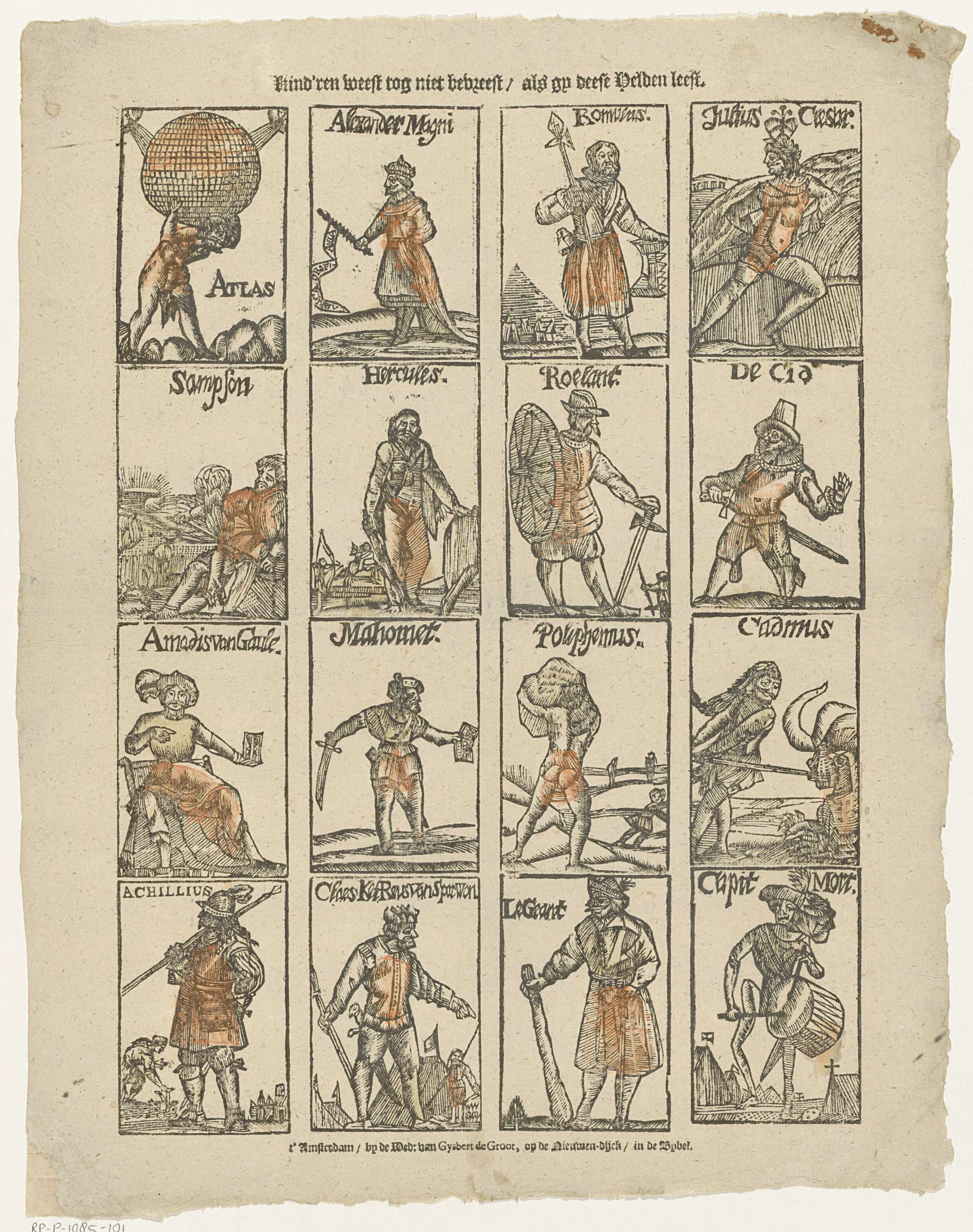 Blad met 16 voorstellingen van mannelijke helden, waaronder Atlas, Roelant en Julius Caesar.
