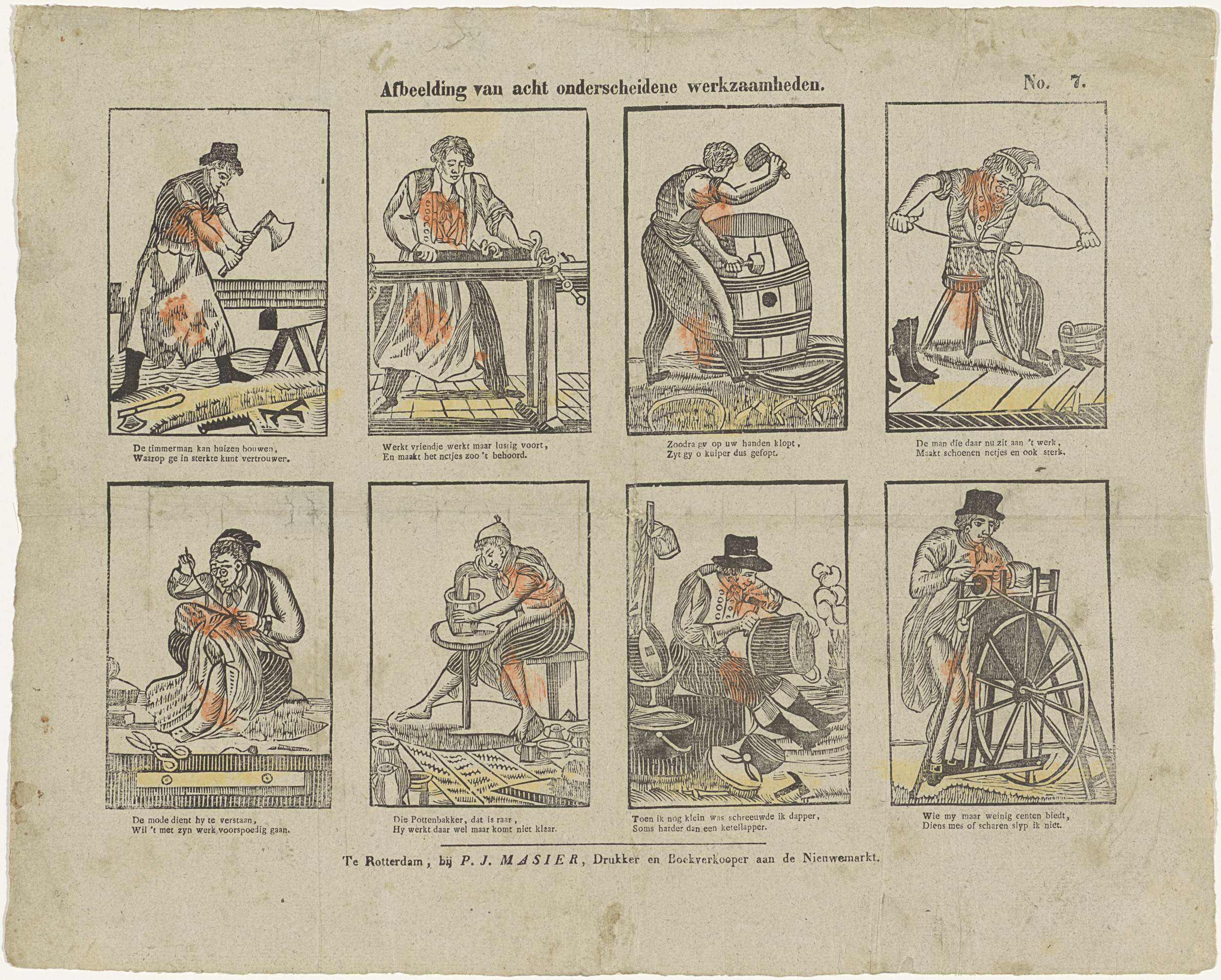 Blad met 8 voorstellingen van ambachtslieden, zoals een timmerman, een schoenmaker en een pottenbakker. Onder elke afbeelding een tweeregelig vers. Genummerd rechtsboven: No. 7.
