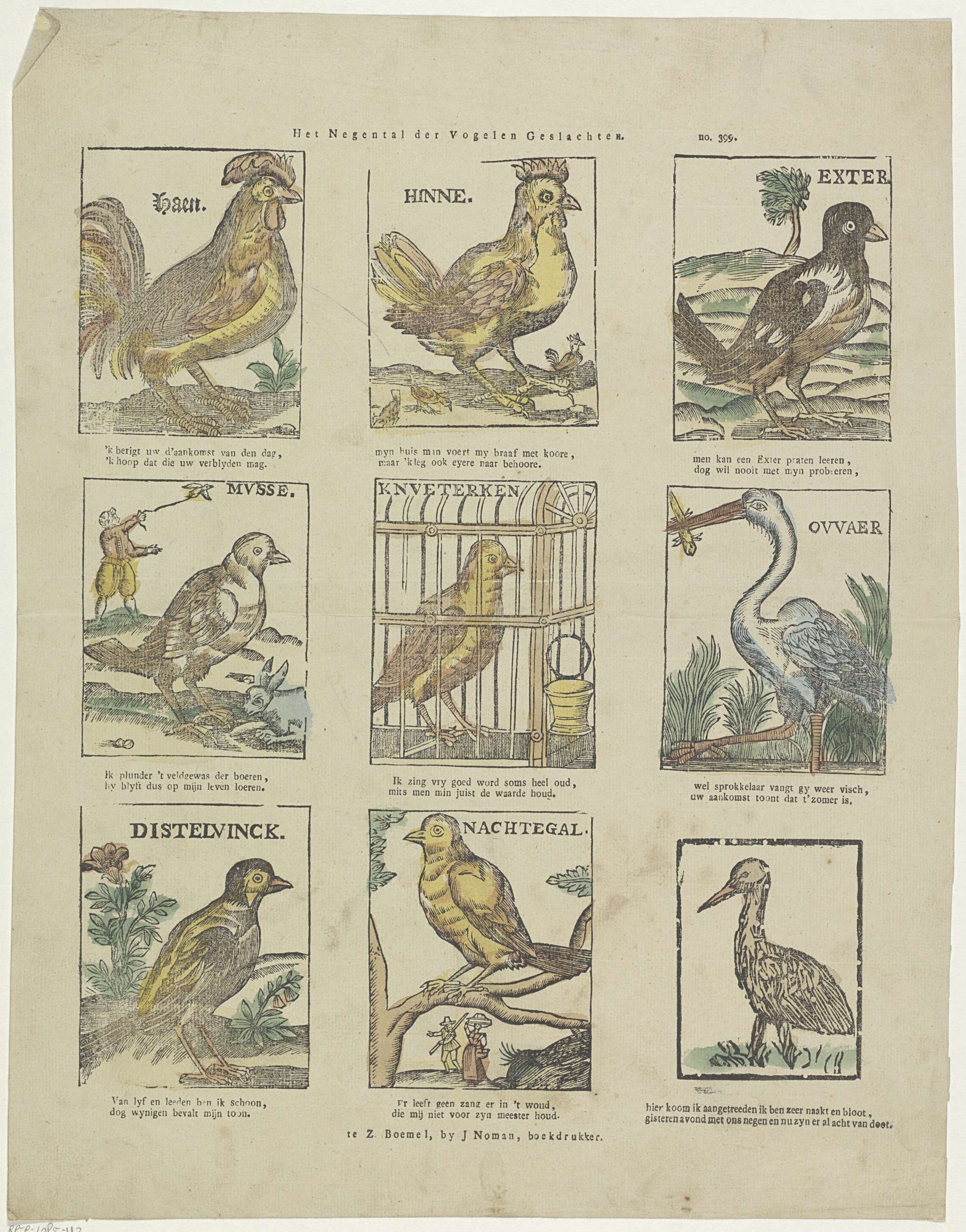 Blad met 9 voorstellingen van verschillende vogels, zoals een haan, een ekster, een mus en een nachtegaal. In elke afbeelding de naam van de vogel. Onder elke afbeelding een tweeregelig vers in boekdruk. Genummerd rechtsboven: no. 399.