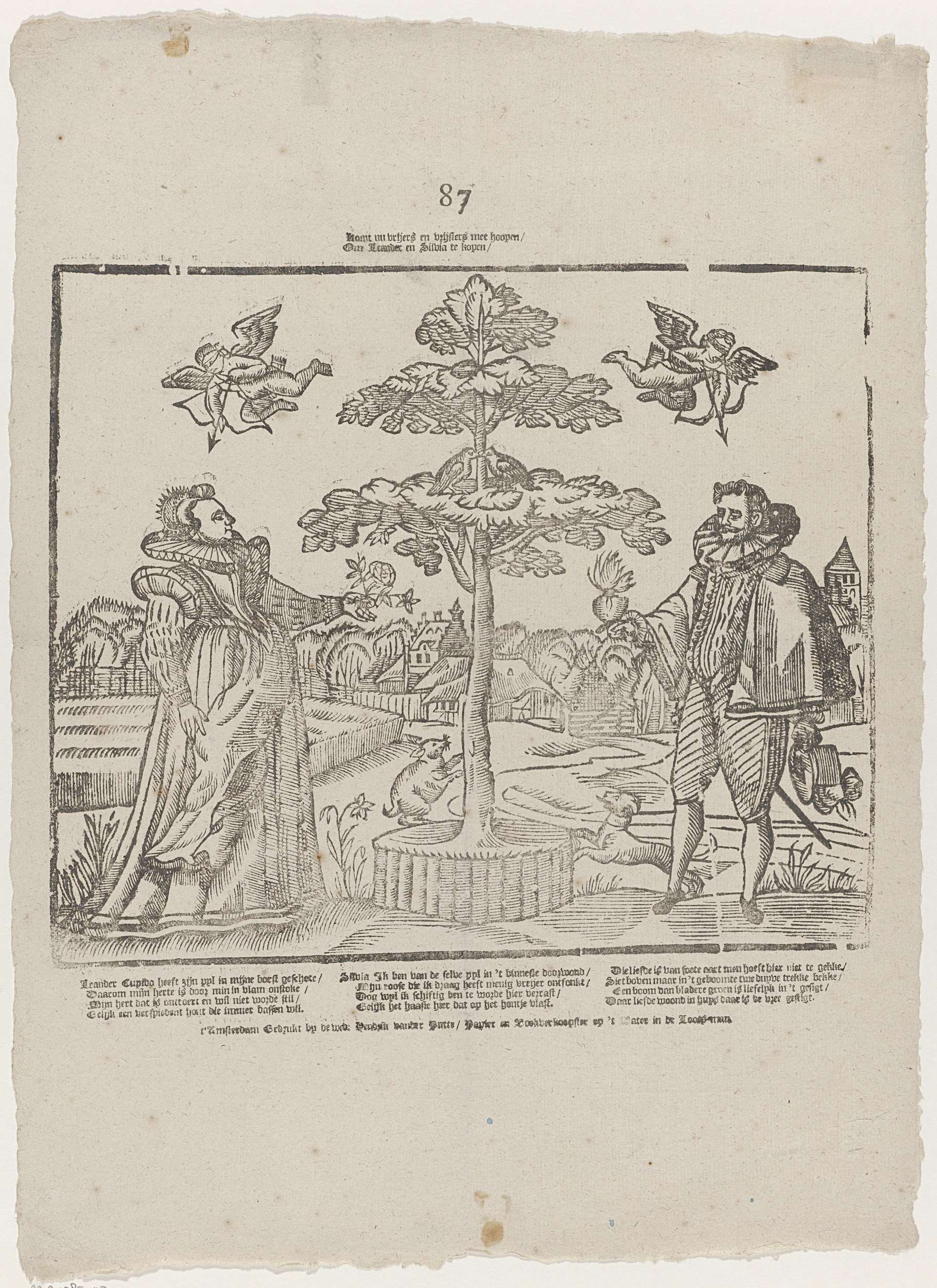 Blad met een grote voorstelling van Leander en Silvia die aan weerszijden van een boom staan. Silvia heeft een roos in haar hand, Leander een vlammend hart. Boven vliegen twee geblinddoekte cupido's, die hun pijlen op Leander en Silvia richten. Onder de afbeelding een twaalfregelig vers in drie kolommen. Genummerd midden boven: 87.