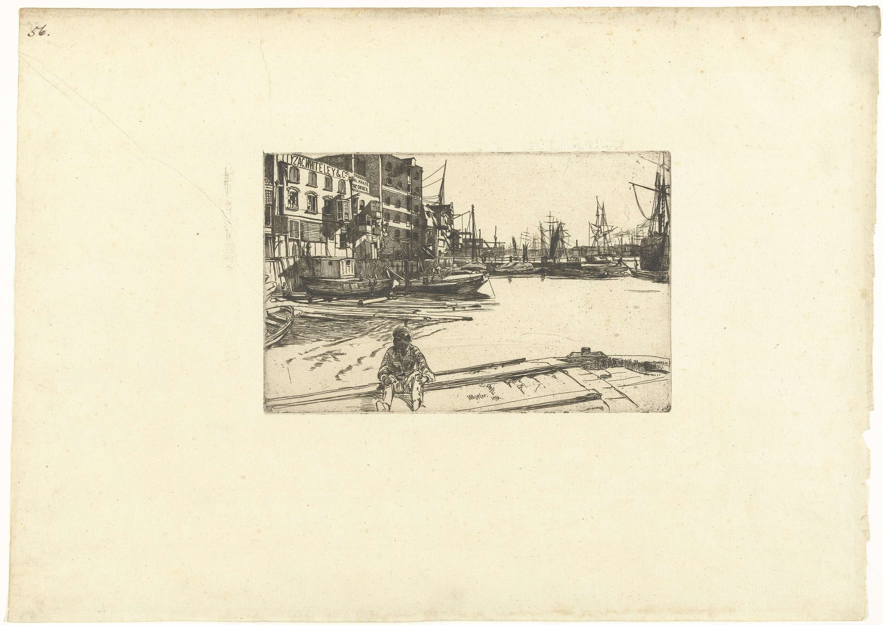 Werf met pakhuizen aan de Theems in Londen, een aantal kleine boten liggen aan de kade. Afgedrukt op Oudhollands papier met brede marges, geleverd door Carel Vosmaer.