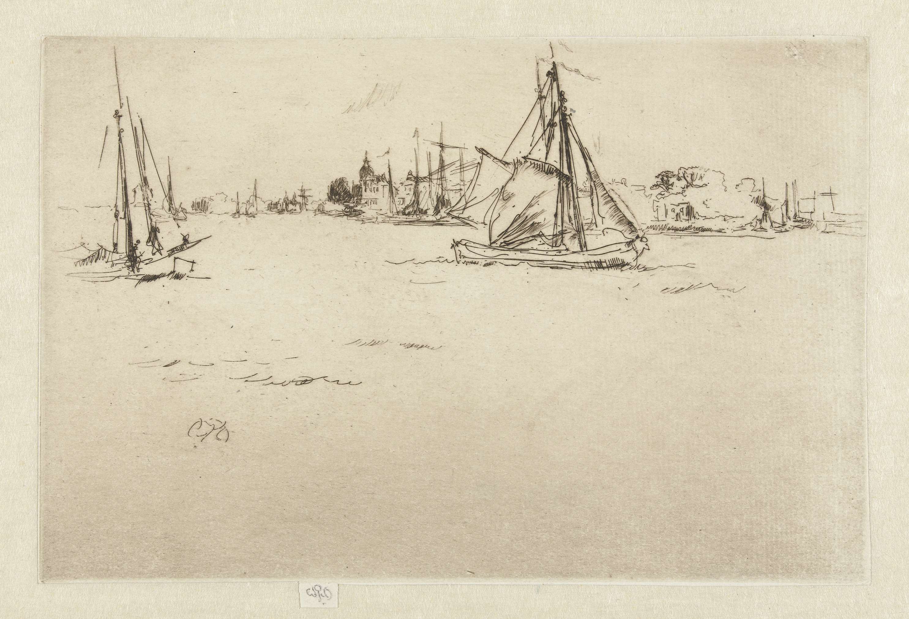 Gezicht op de stad Dordrecht vanuit Papendrecht, in het midden de Groothoofdspoort. Spiegelbeeldig.