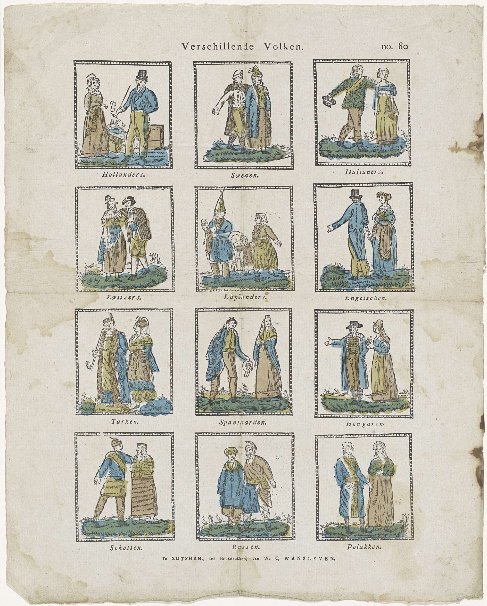 Blad met 12 voorstellingen van paren van verschillende volken, waaronder Hollanders, Zweden, Engelsen en Polen. Onder elke afbeelding een onderschrift. Genummerd rechtsboven: no. 80.
