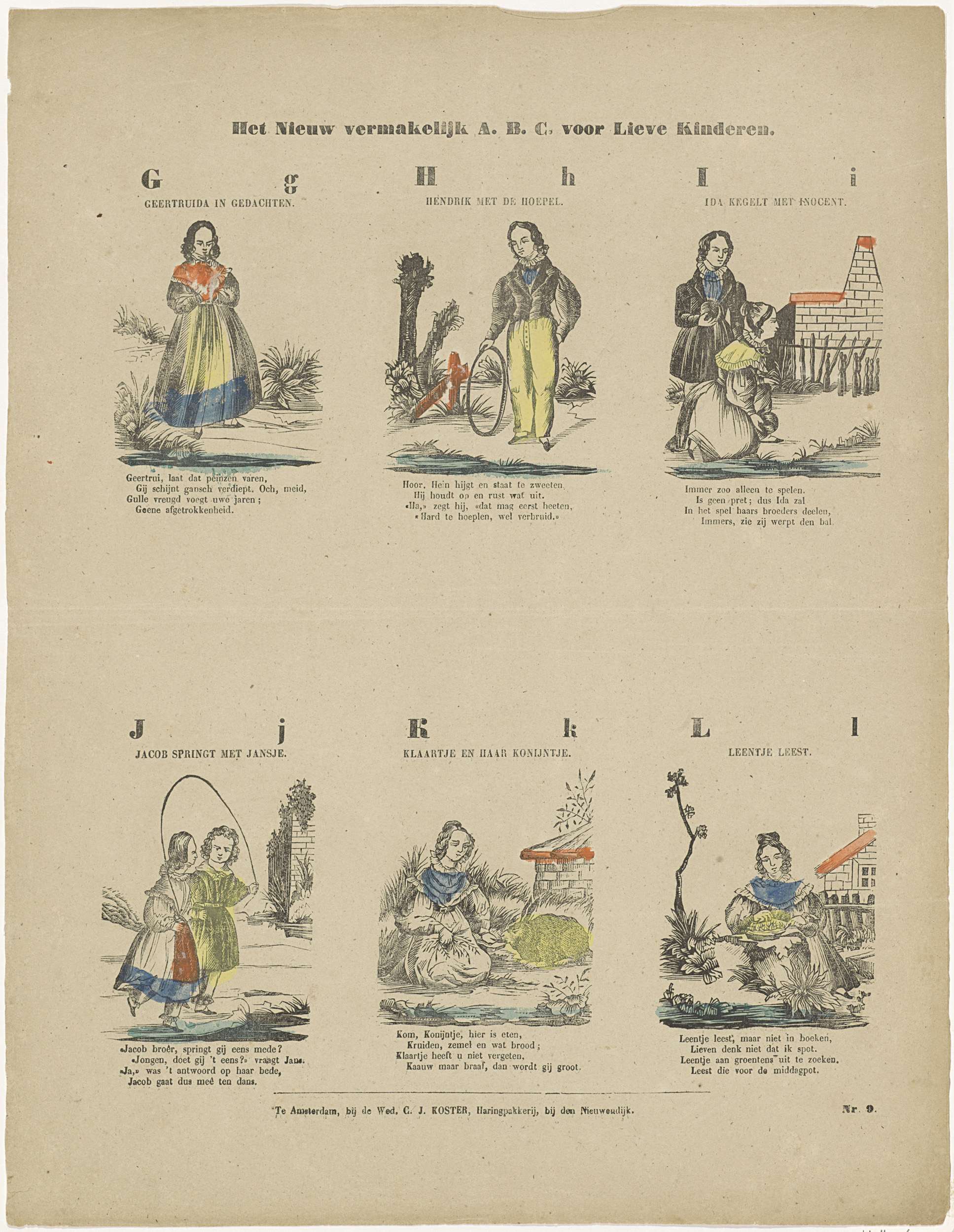 Blad met 6 voorstellingen van de letters van het alfabet (G-L) geïllustreerd met spelende kinderen waarvan de namen met de betreffende letter beginnen. Onder elke afbeelding een vierregelig vers en boven elke afbeelding een titel. Genummerd rechtsonder: Nr. 9.