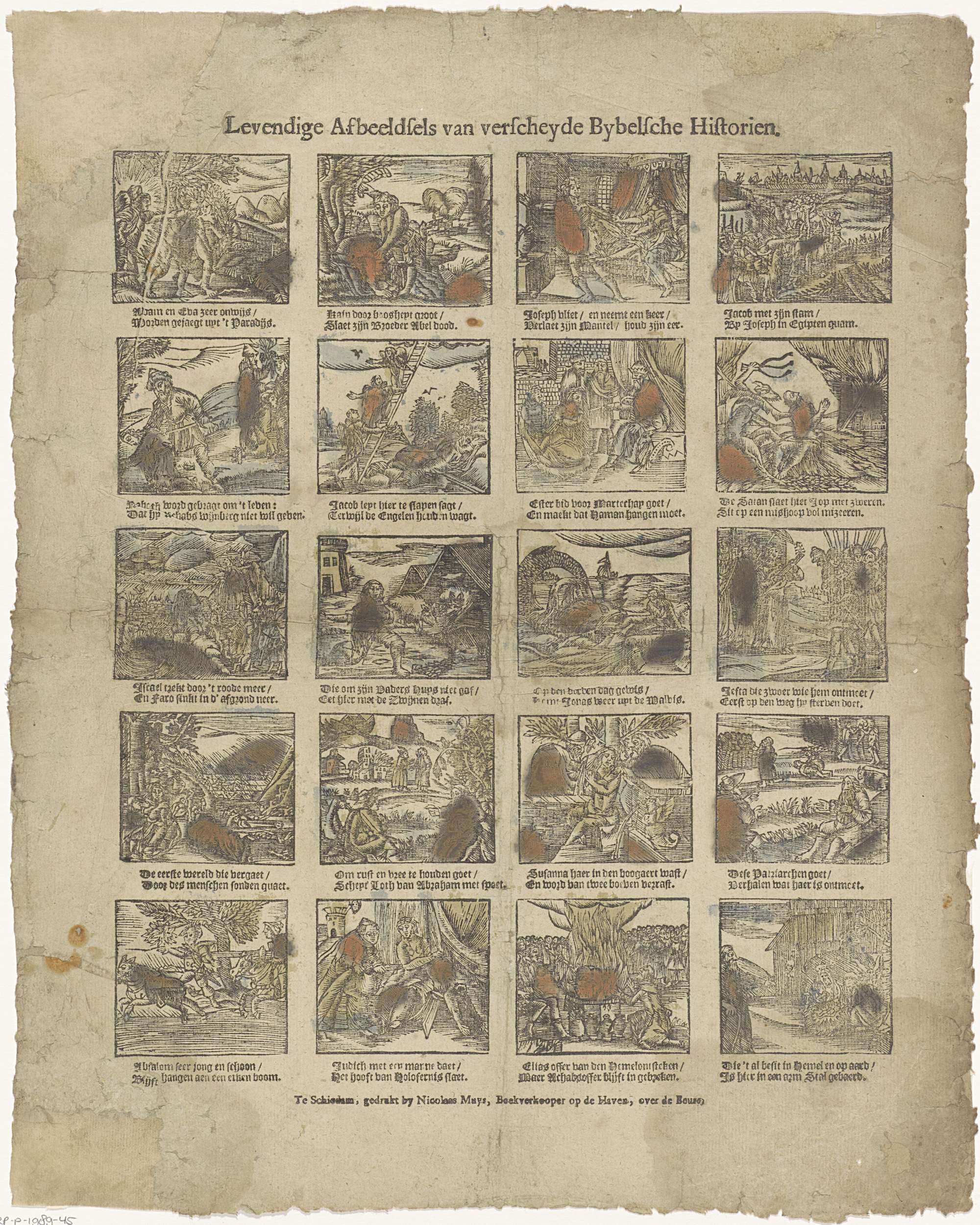 Blad met 20 voorstellingen uit het Oude Testament, waaronder Kaïn die Abel vermoordt, Jakobs ladder en Susanna die wordt bespied door twee oudere mannen. Onder elke afbeedling een tweeregelig vers.