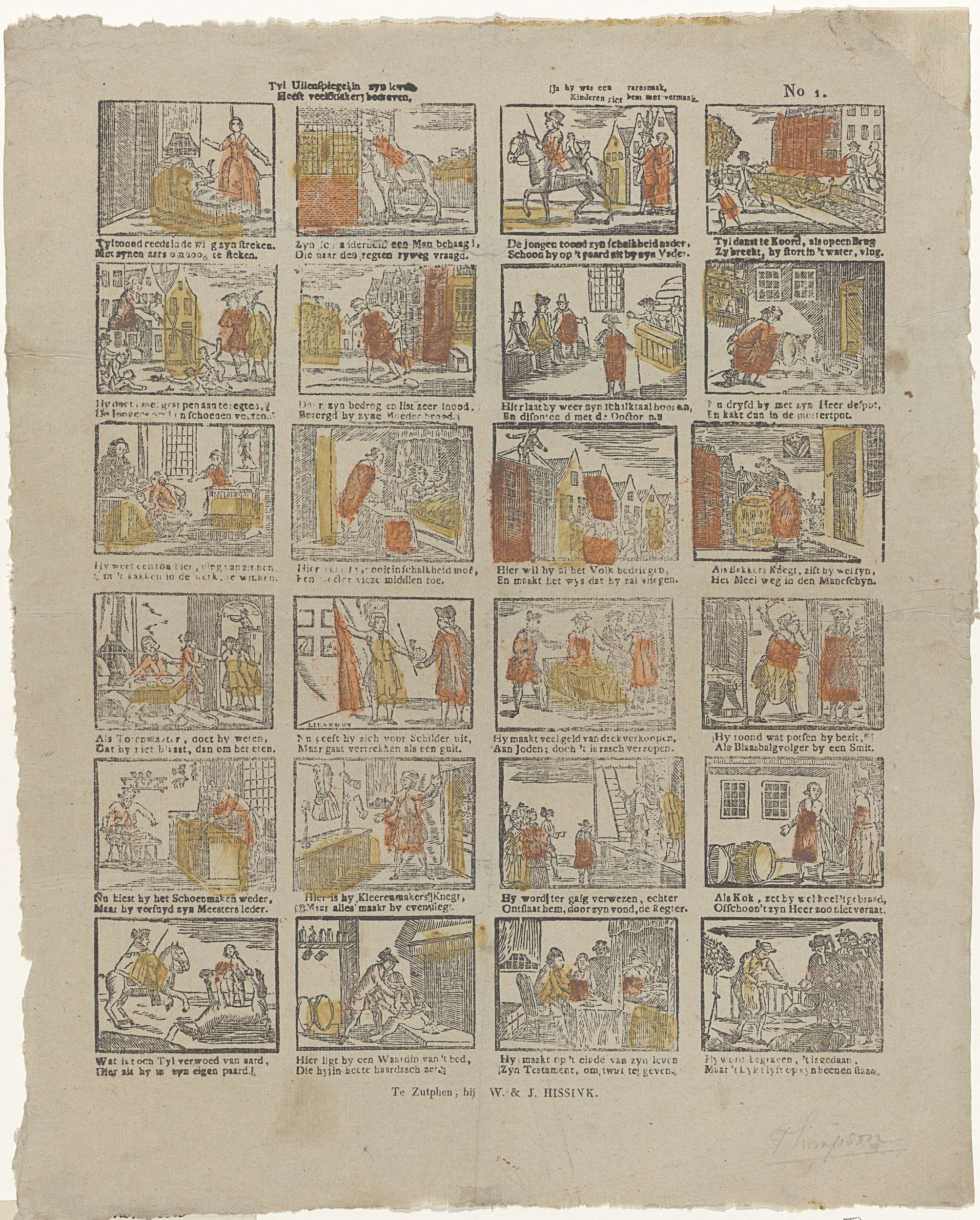 Blad met 24 voorstellingen over het leven van Tijl Uilenspiegel. Onder elke afbeelding een tweeregelig vers. Genummerd rechtsboven: No. 1.