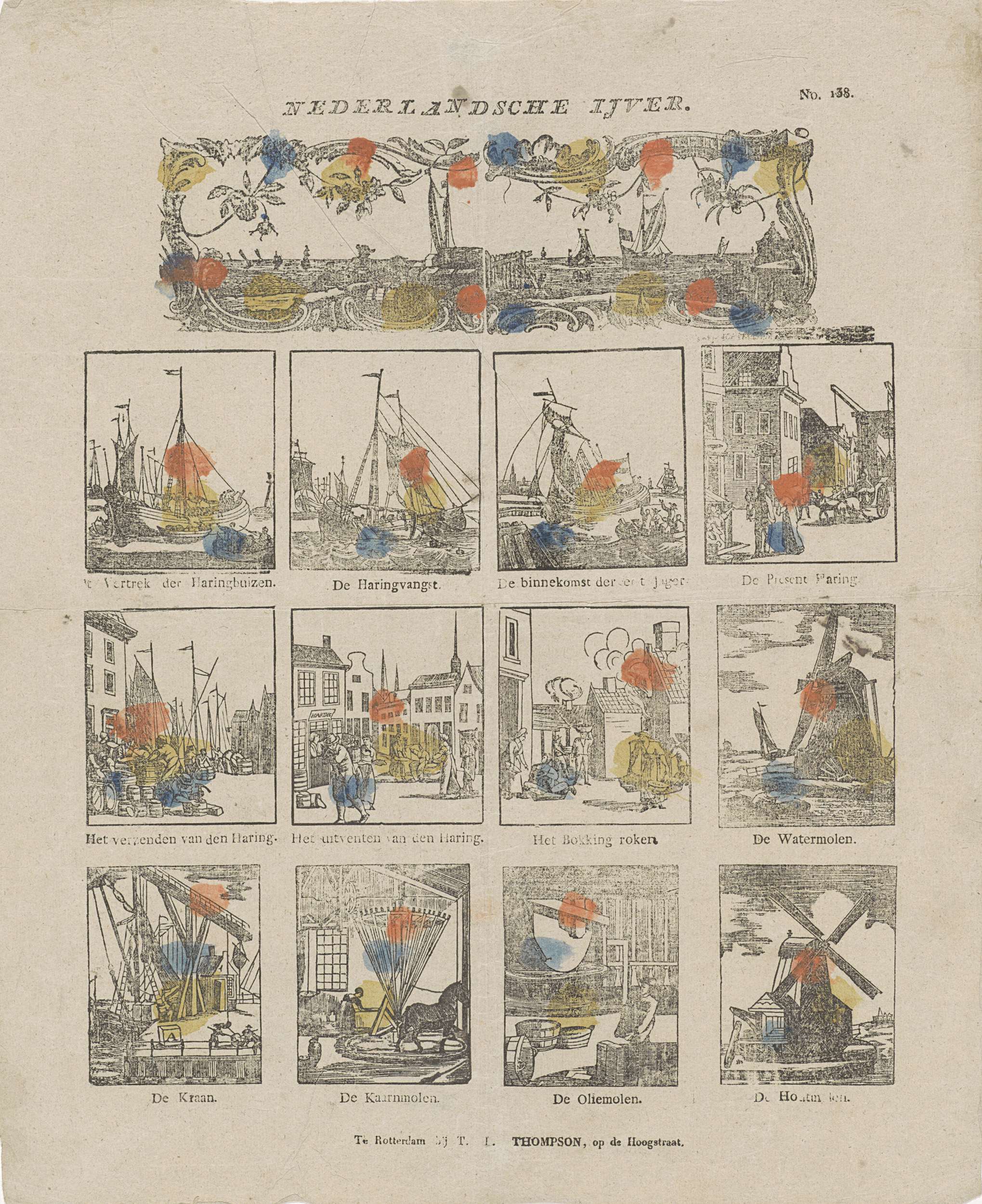 Blad met 13 voorstellingen, waaronder acht voorstellingen van de haringvangst en vijf voorstellingen van molens. Onder elke afbeelding een onderschrift. Genummerd rechtsboven: No. 138.