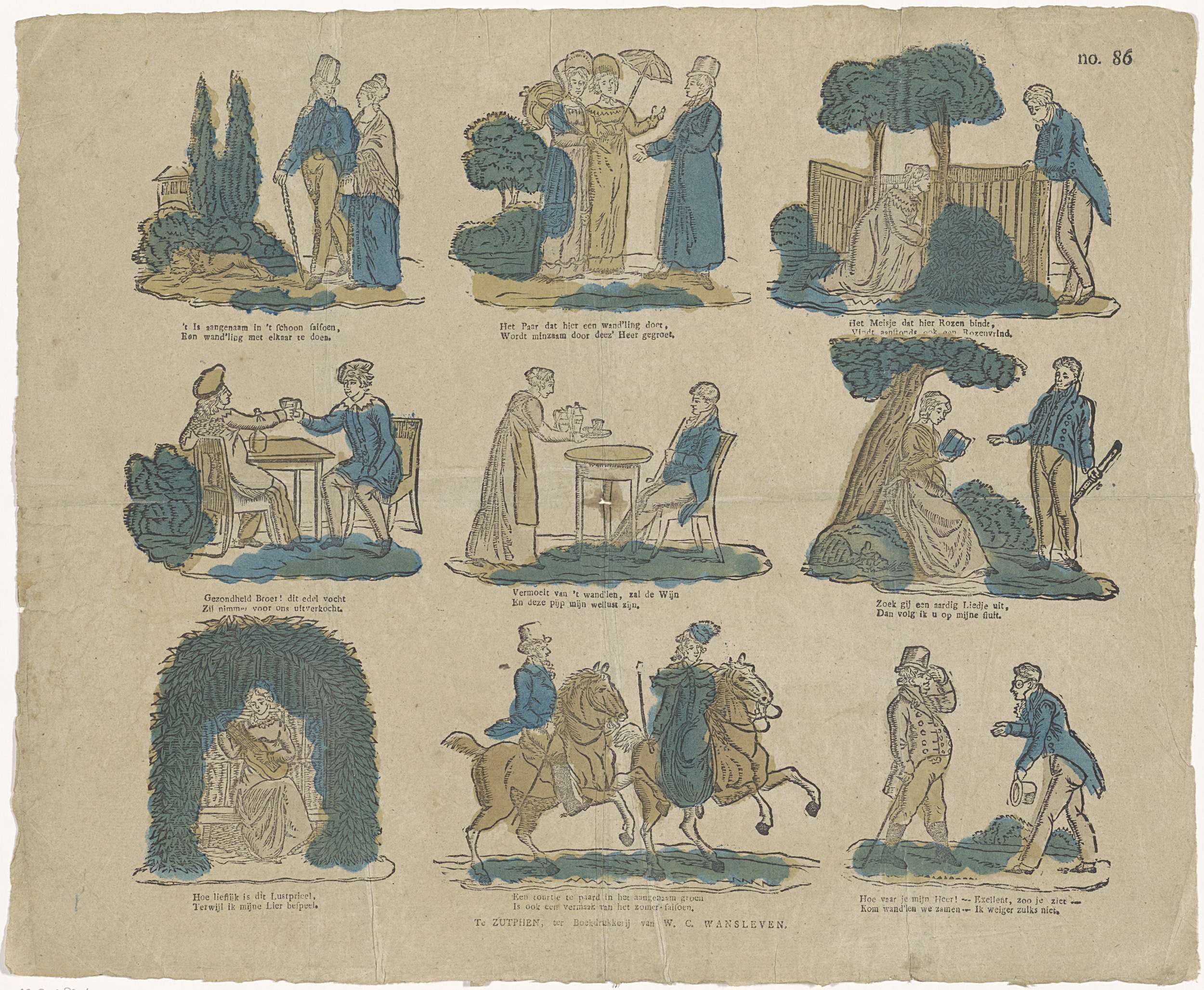 Blad met 9 voorstellingen van verschillende bezigheden, waaronder wandelen, drinken en de lier bespelen. Onder elke afbeelding een tweeregelig vers. Genummerd rechtsboven: no. 86.