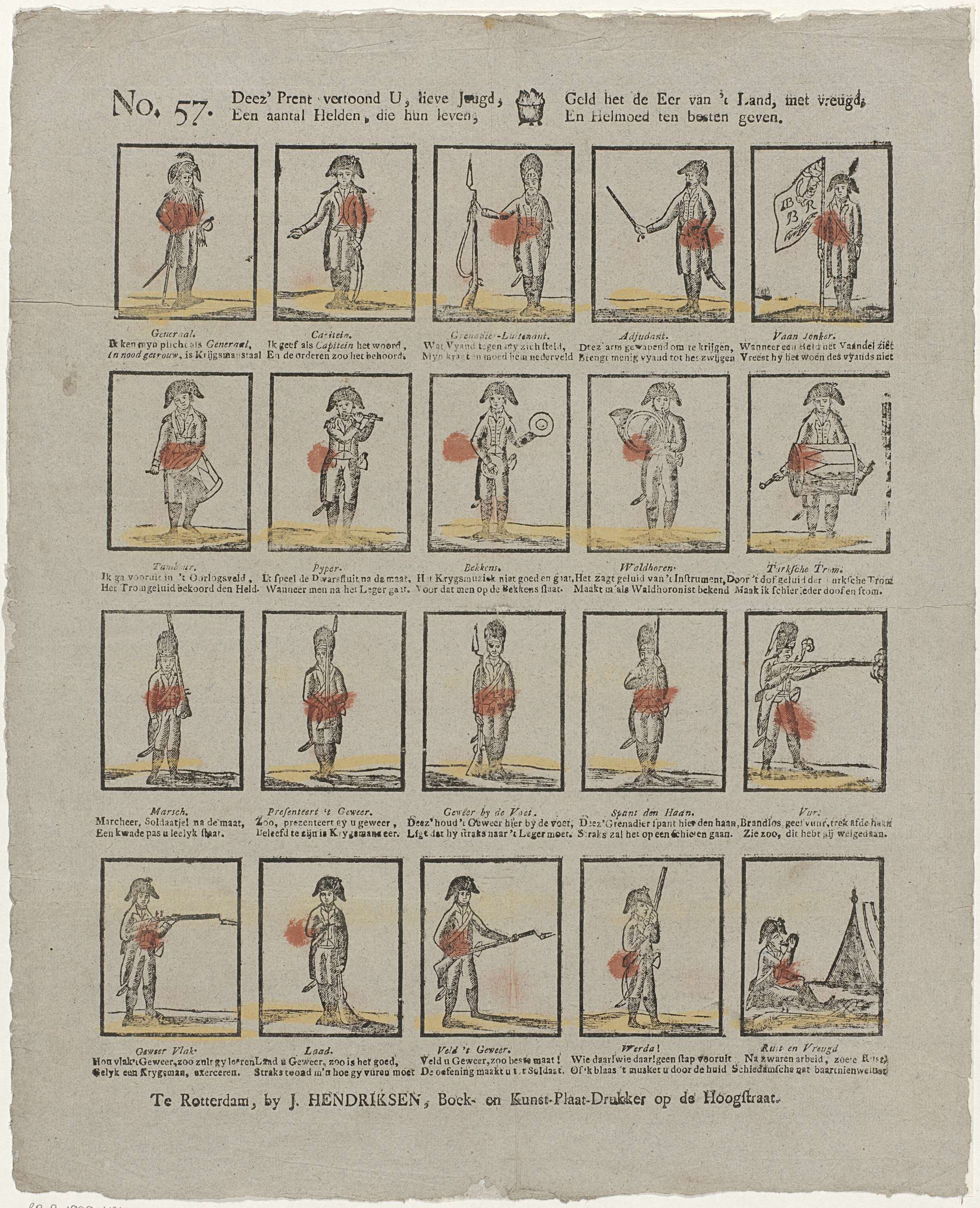 Blad met 20 voorstellingen van militairen. Onder elke afbeelding een tweeregelig vers. Genummerd linksboven: No. 57.