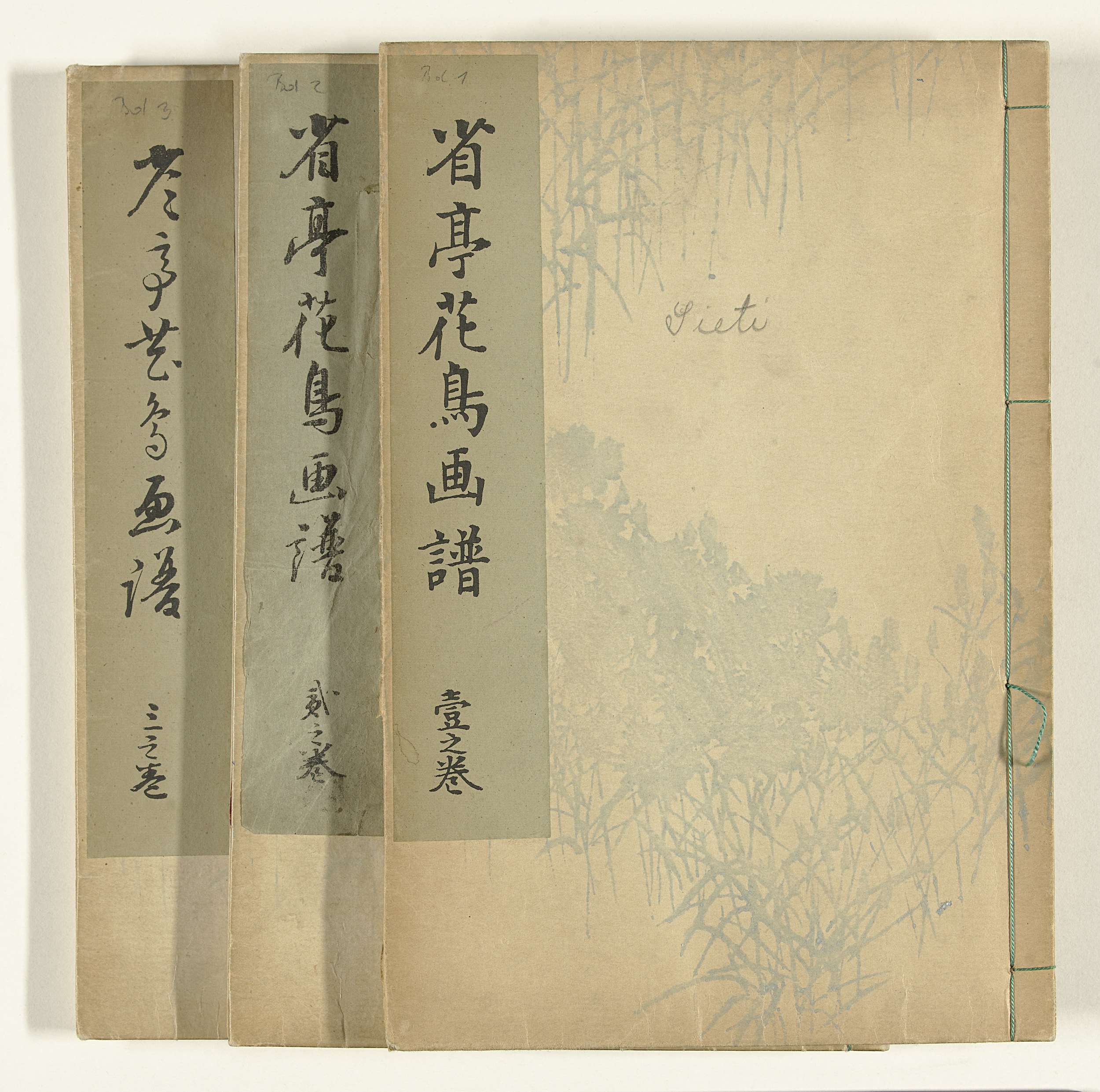 Boek uit drie delen (compleet) met afbeeldingen van bloemen en vogels.
