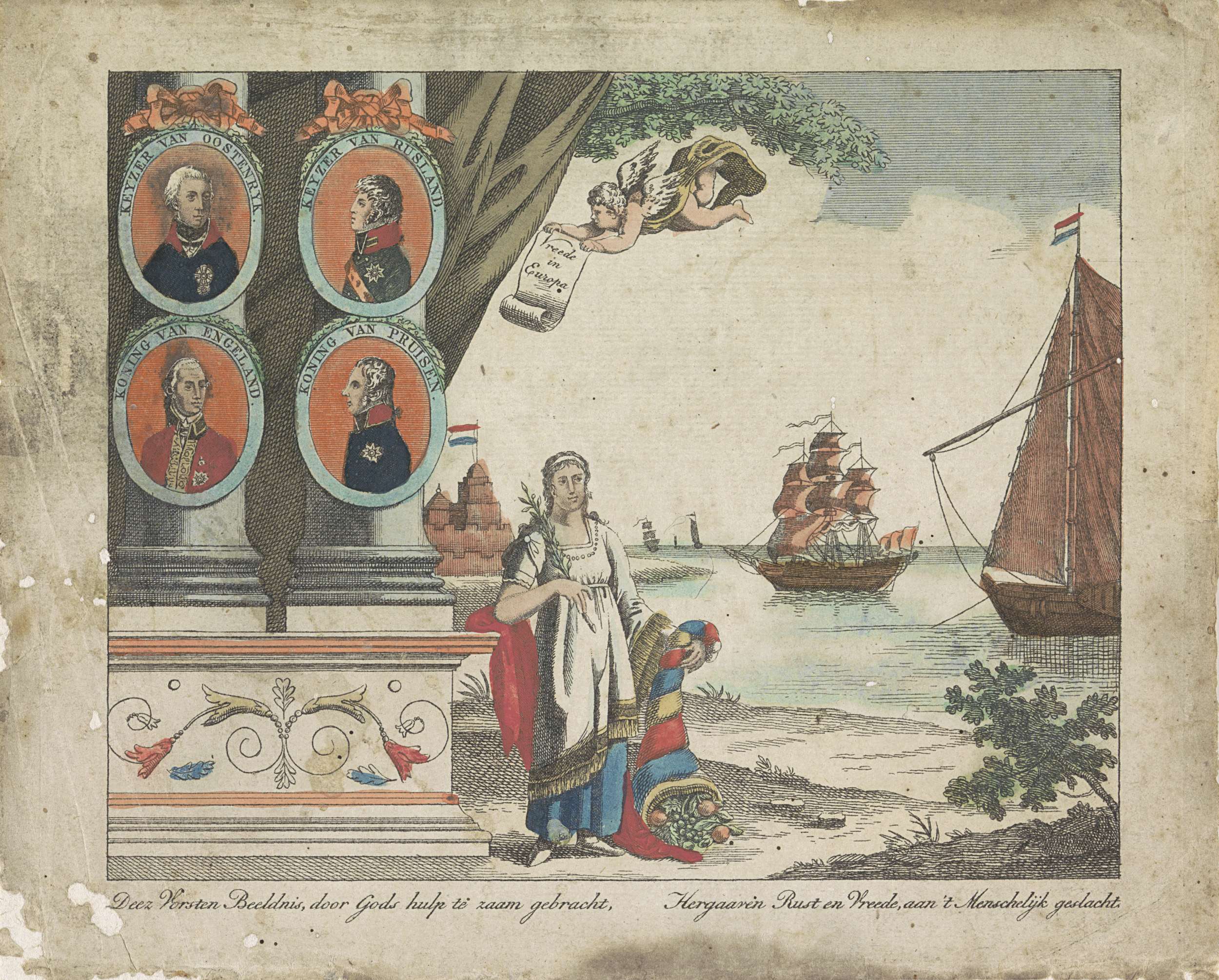 Allegorie op de eerste Vrede van Parijs, 30 mei 1814. Kustlandschap met de personificatie van de Vrede staande met olijftak en hoorn van overvloed. Links een monument met de portretten van de vorsten van de vier bondgenoten in de strijd tegen Napoleon: de keizer van Oostenrijk, de tsaar van Rusland, de koning van Engeland en ...