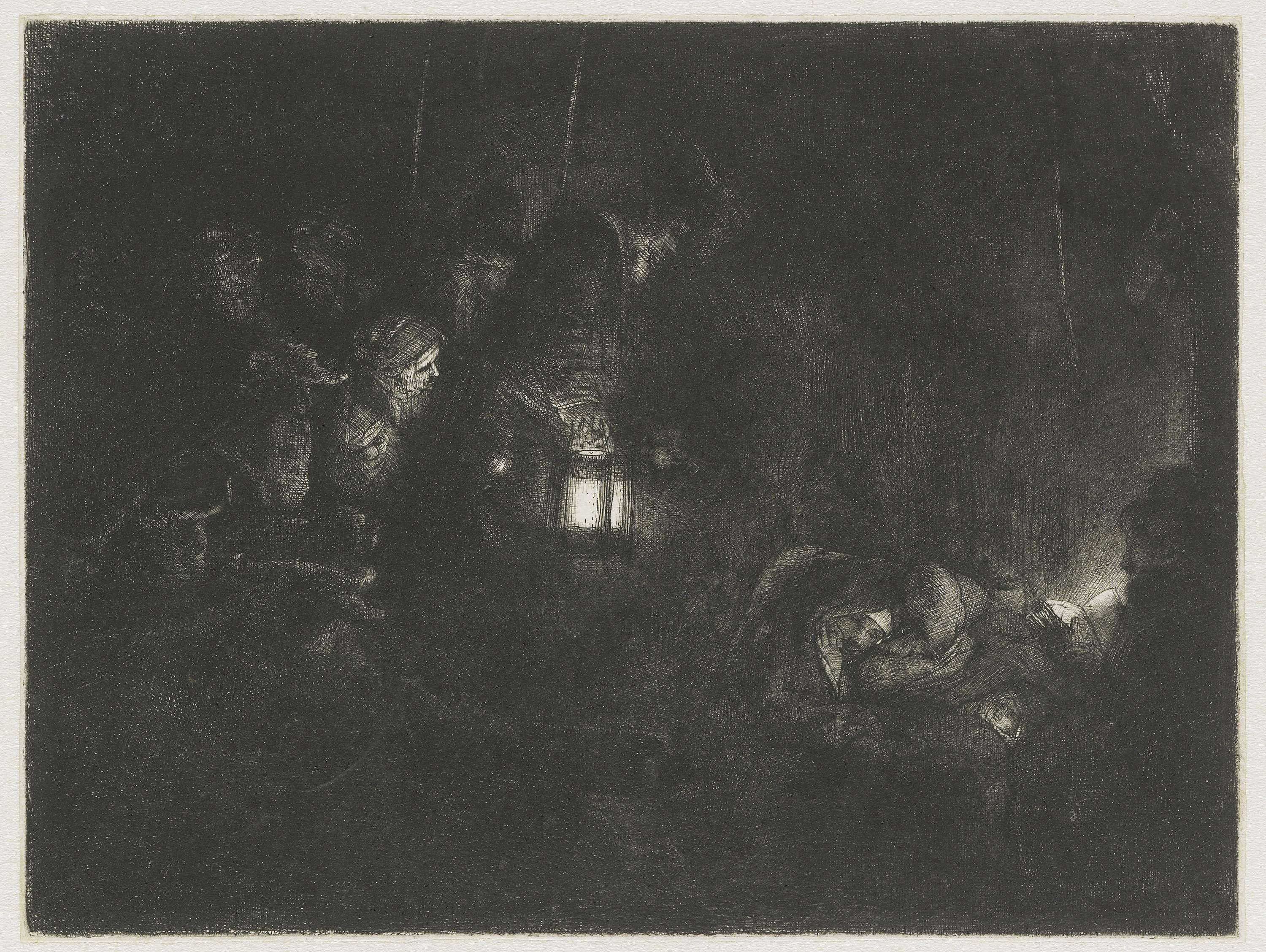 De aanbidding van de herders is vaak uitgebeeld in de prentkunst. Rembrandts versie is uitzonderlijk door de extreme wijze waarop hij het nachtelijk duister in de stal weergaf. Om die duisternis voor elkaar te krijgen maakte hij iedere volgende staat donkerder. In deze afdruk intensiveerde hij de schaduw rond Jozef, zodat alleen zijn boek en ...