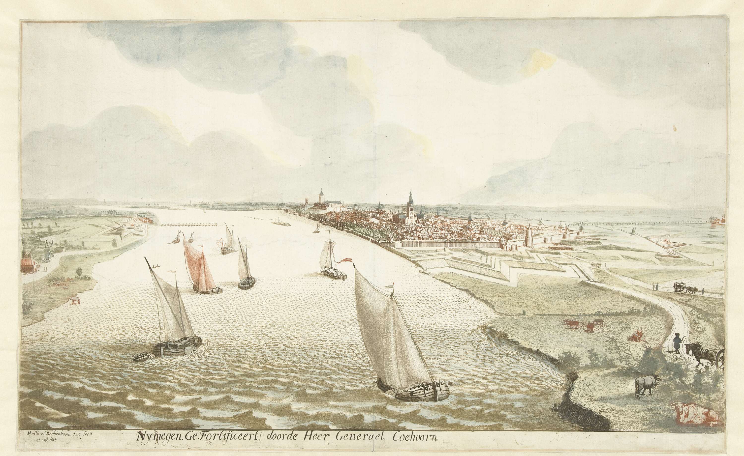 Gezicht op de Waal en Nijmegen met zijn versterkingen. Op de rivier varen zeilschepen.