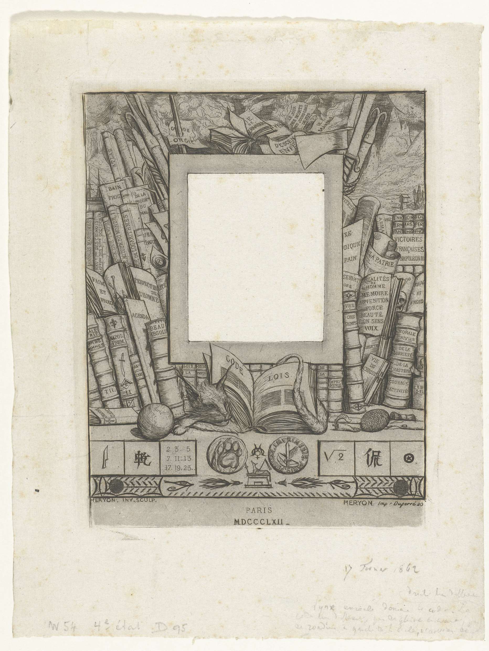 Omlijsting met allegorische voorstelling van de uitvinding en toepassing van de drukkunst. Boeken met titels op de banden en drukkersgereedschappen staan op elkaar gestapeld ronde een leeg kader. Onder het kader, bedoeld voor het portret van de drukker Armand Guéraud, ligt een lynx met een wetboek tussen staart en poten. In een band onderaan staan ...
