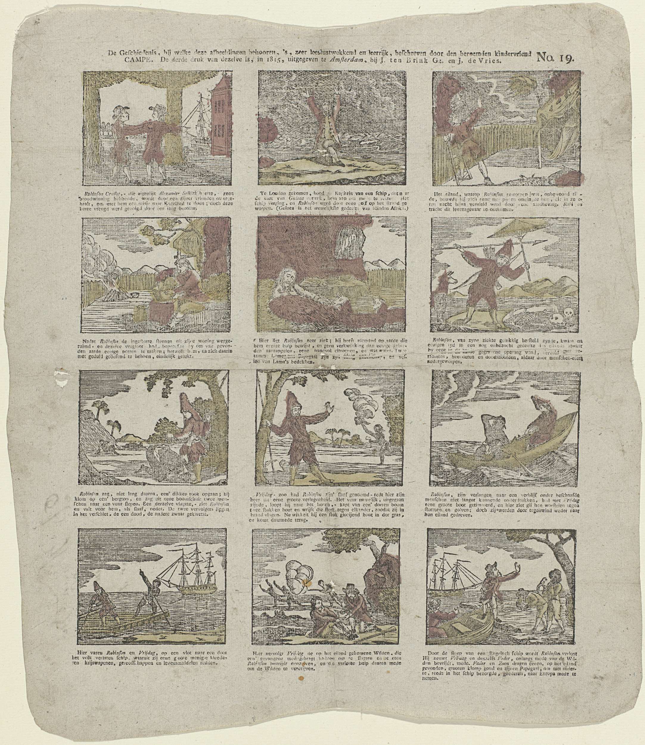 Blad met 12 voorstellingen uit het verhaal van Robinson Crusoe die strandt op een eiland. Onder elke afbeelding een onderschrift. Genummerd rechtsboven: No. 19.