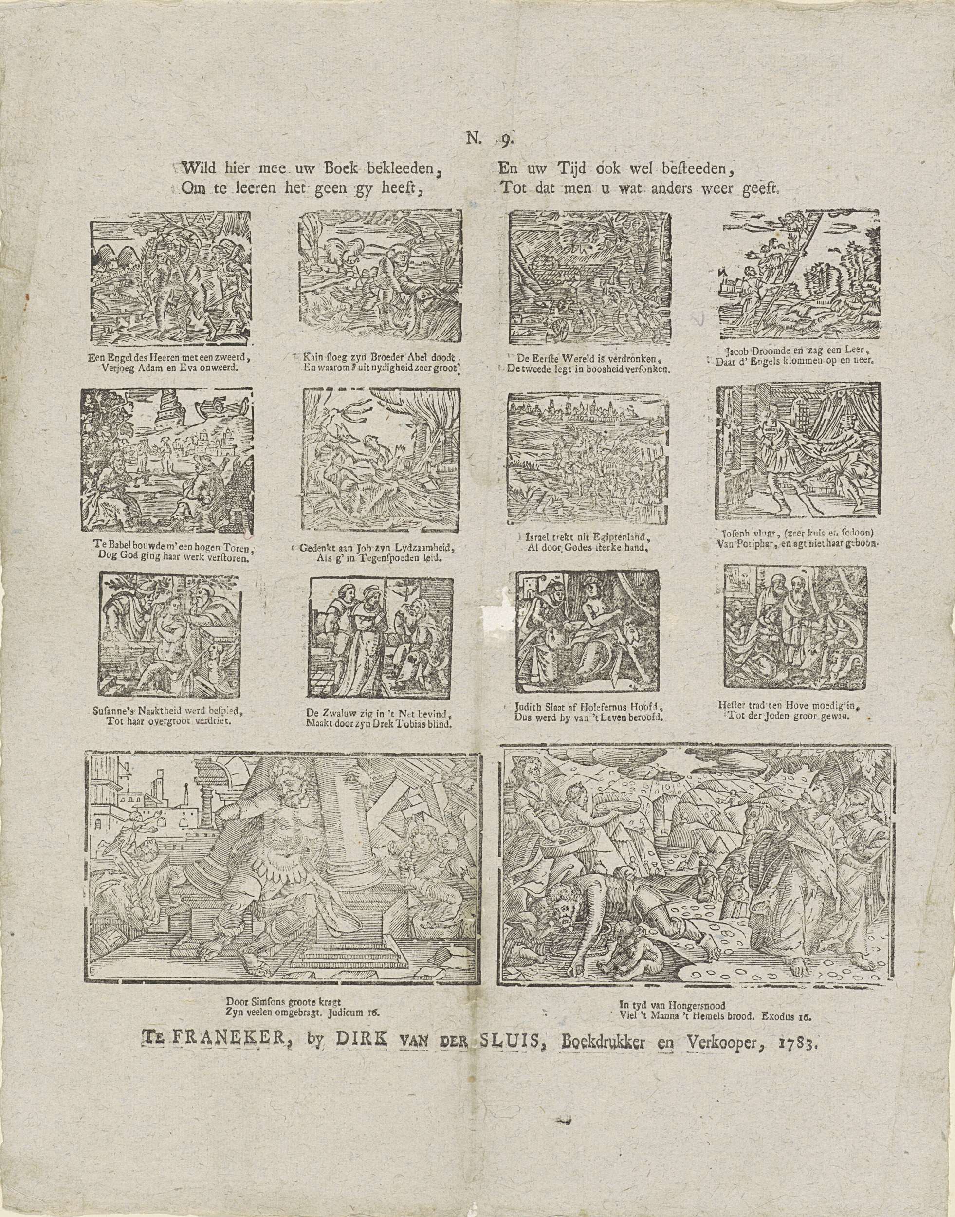 Blad met 12 kleine en 2 grote voorstellingen van verhalen uit het Oude Testament. Onder elke afbeelding een onderschrift. Genummerd midden boven: N. 9.