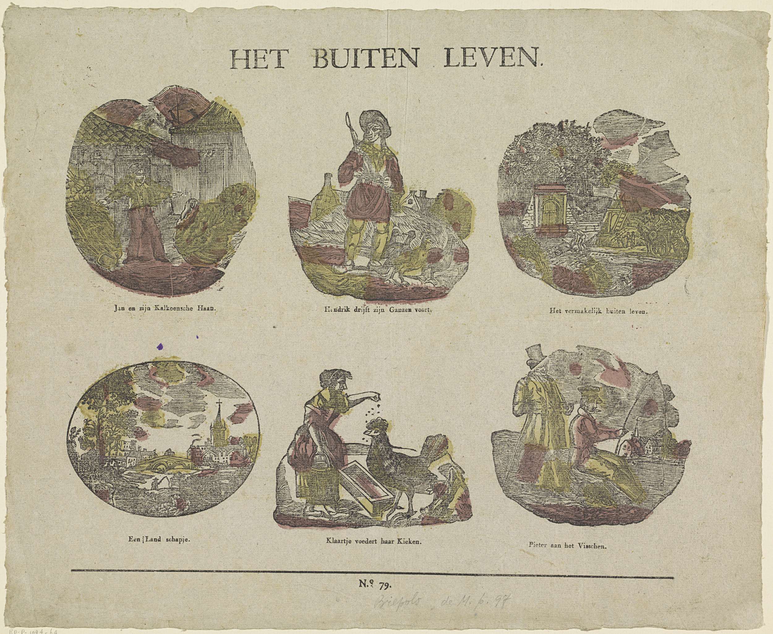 Blad met 6 voorstellingen van het buitenleven, zoals Hendrik met zijn ganzen en Klaartje die een haan voert. Onder elke afbeelding een onderschrift. Genummerd midden onder: No. 79.
