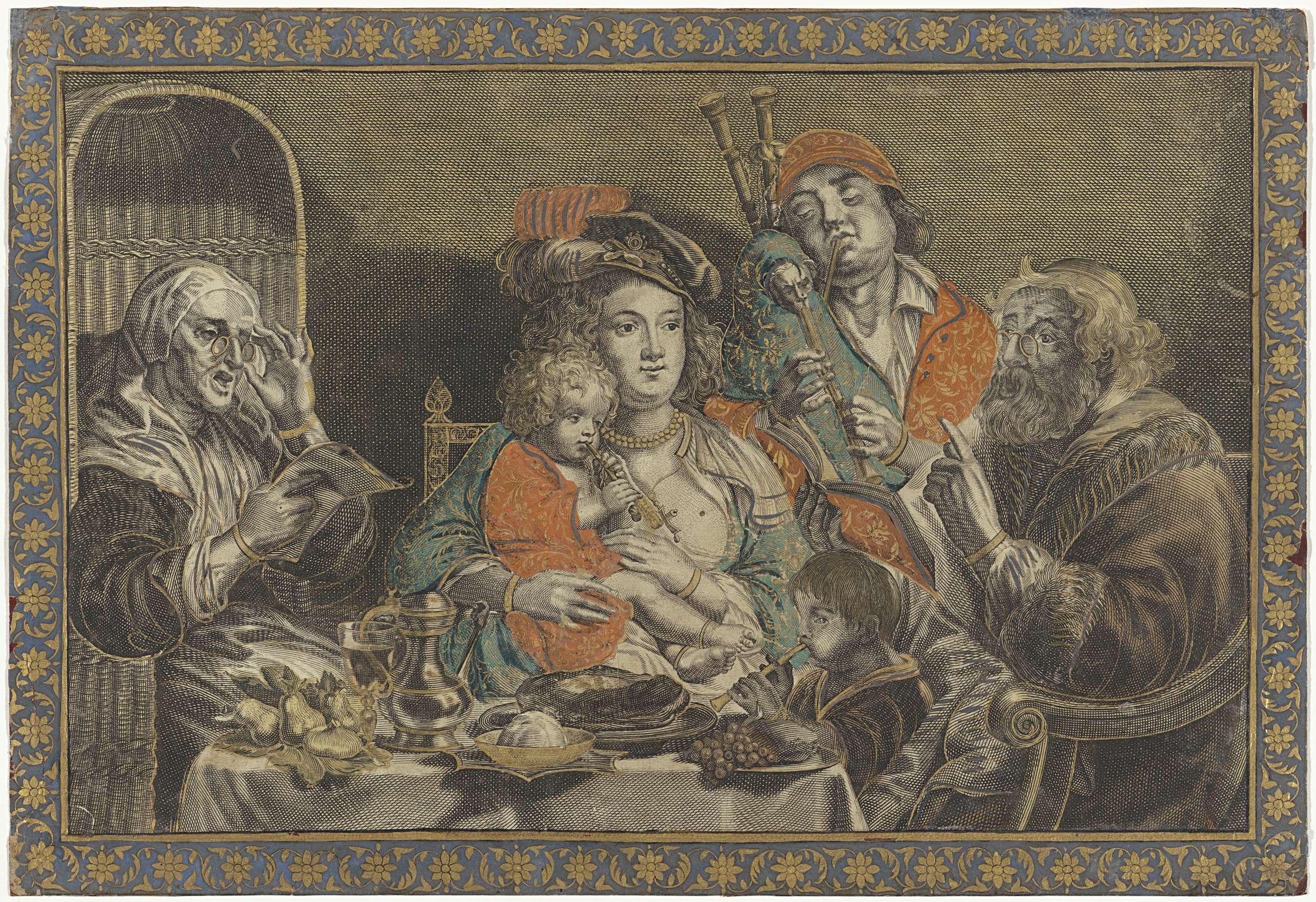 Gezelschap aan tafel: twee oude mensen, een dame met kind op schoot, een jongetje en een doedelzakspeler. De oude man en vrouw zingen; de kinderen spelen op de fluit. Verbeelding van het spreekwoord 'Zo d'ouden zongen, zo pijpen de jongen'. In ornamentrand
