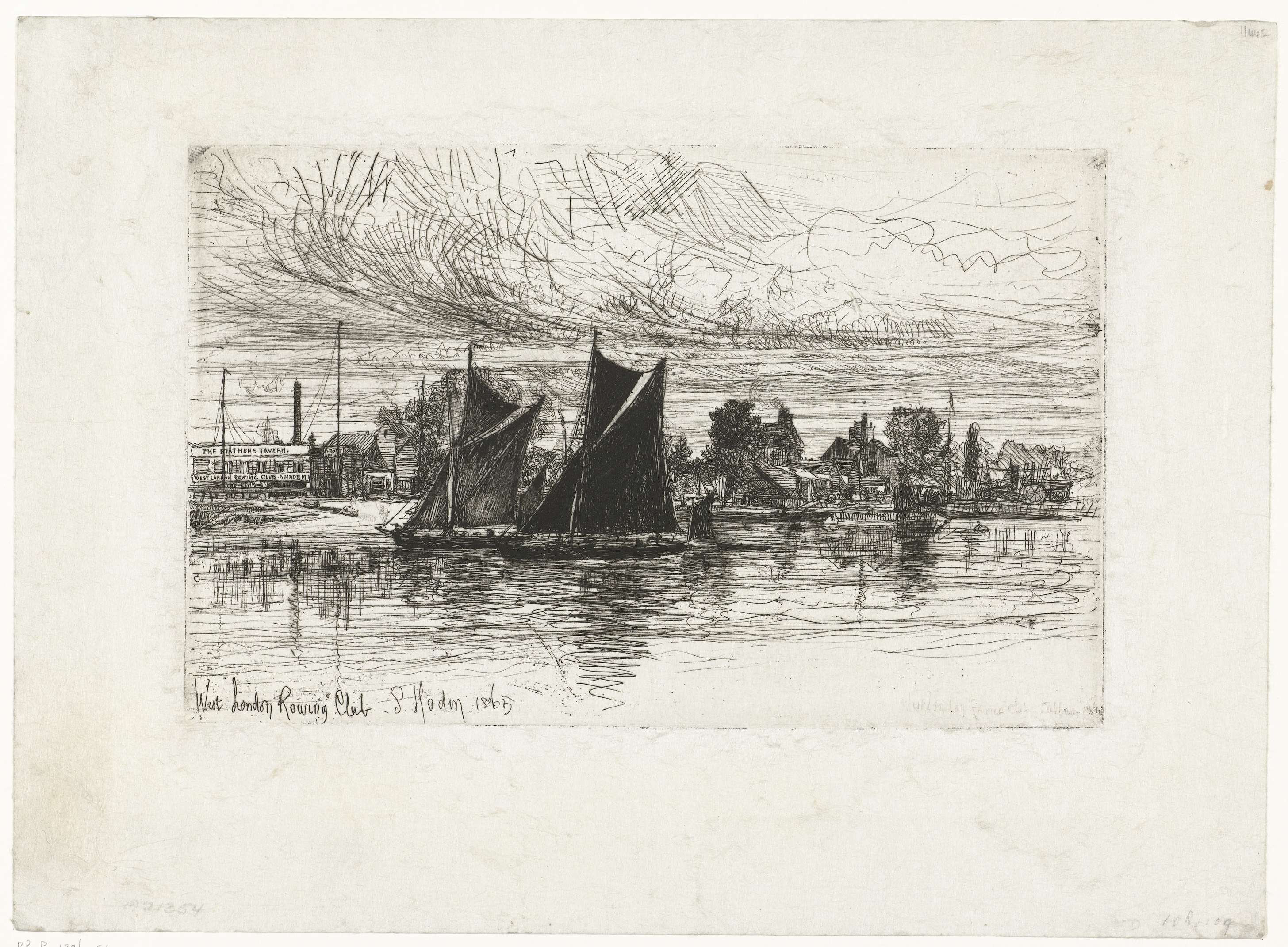 De rivier de Theems op de voorgrond, met twee zeilschepen. Links het clubgebouw van de West Londen Rowing Club, The Feathers Tavern. Rechts aan de oever enkele huizen en een auto.