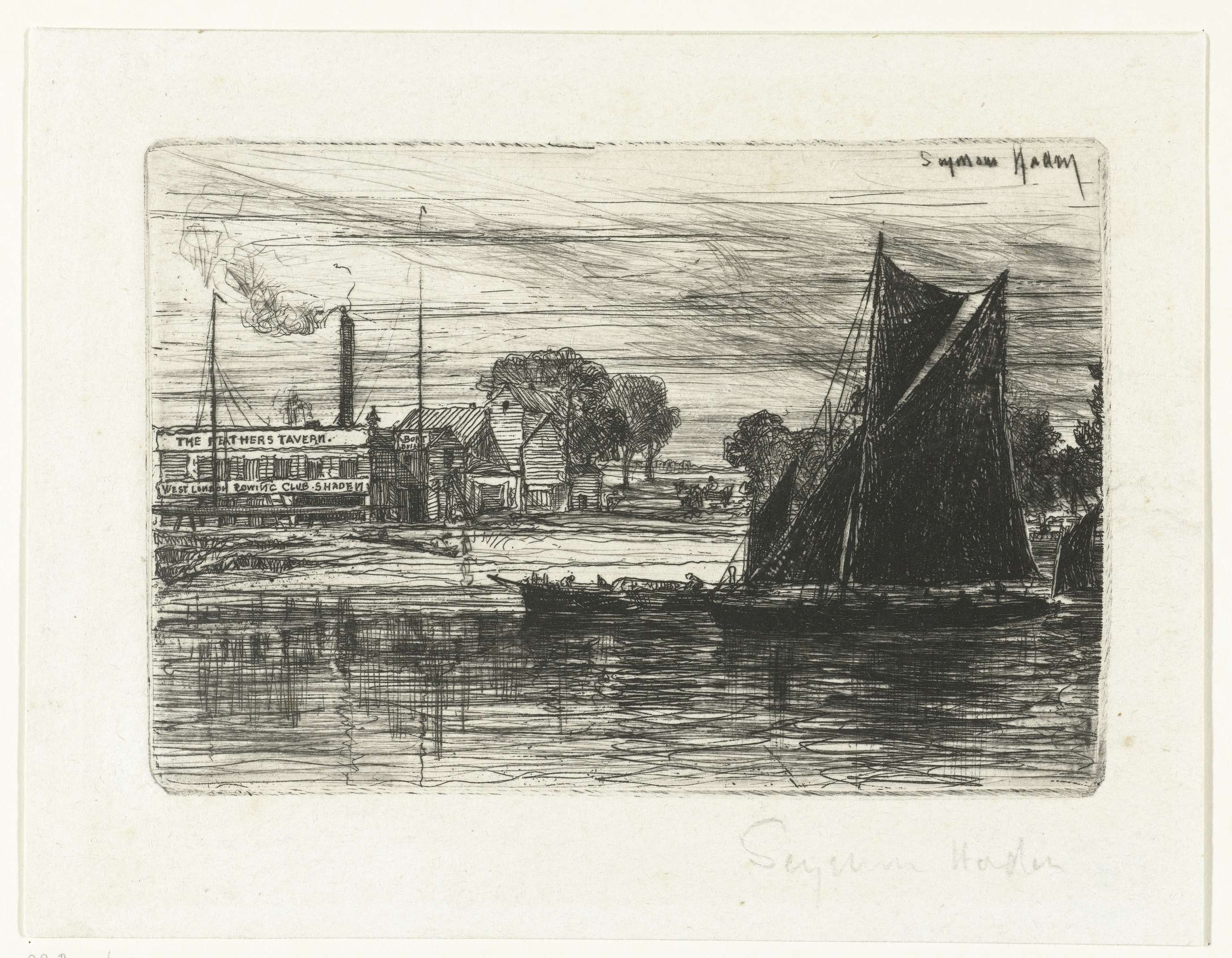 De rivier de Theems bij Mortlake, met rechts een zeilschip. Links op de oever het clubgebouw van de West Londen Rowing Club, The Feathers Tavern.