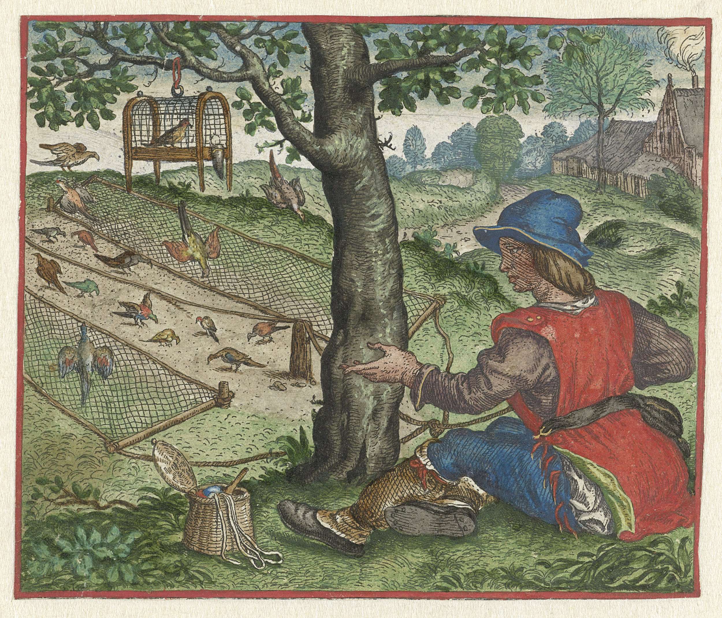 Op de voorgrond een vogelvanger, zittend onder een boom. Hij houdt de touwen vast waarmee hij de netten kan aantrekken. De man heeft te veel zaad gestrooid waardoor veel verschillende vogels op de netten voedsel oppikken. Daardoor kan hij de val niet dicht trekken. Het is beter je te concentreren op een zaak dan te ...