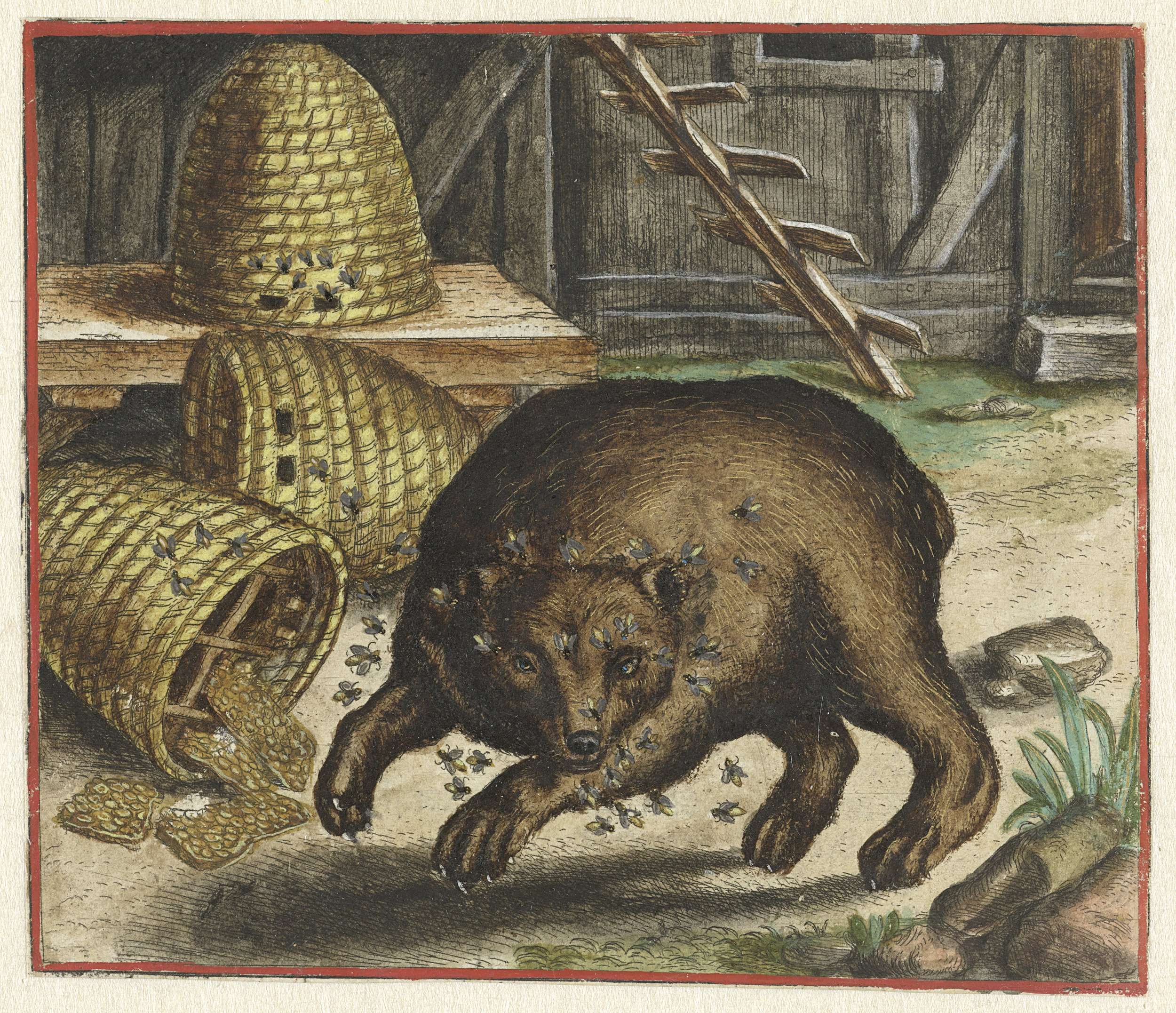Een beer bij drie bijenkorven. Hij is gestoken door een bij en heeft in zijn woede één van de korven laten omvallen. Hij wordt daarom aangevallen door de bijen die uit de omgevallen korf zwermen. Het is beter lijdzaam dingen te aanvaarden, dan wraak te zoeken en meer te lijden.