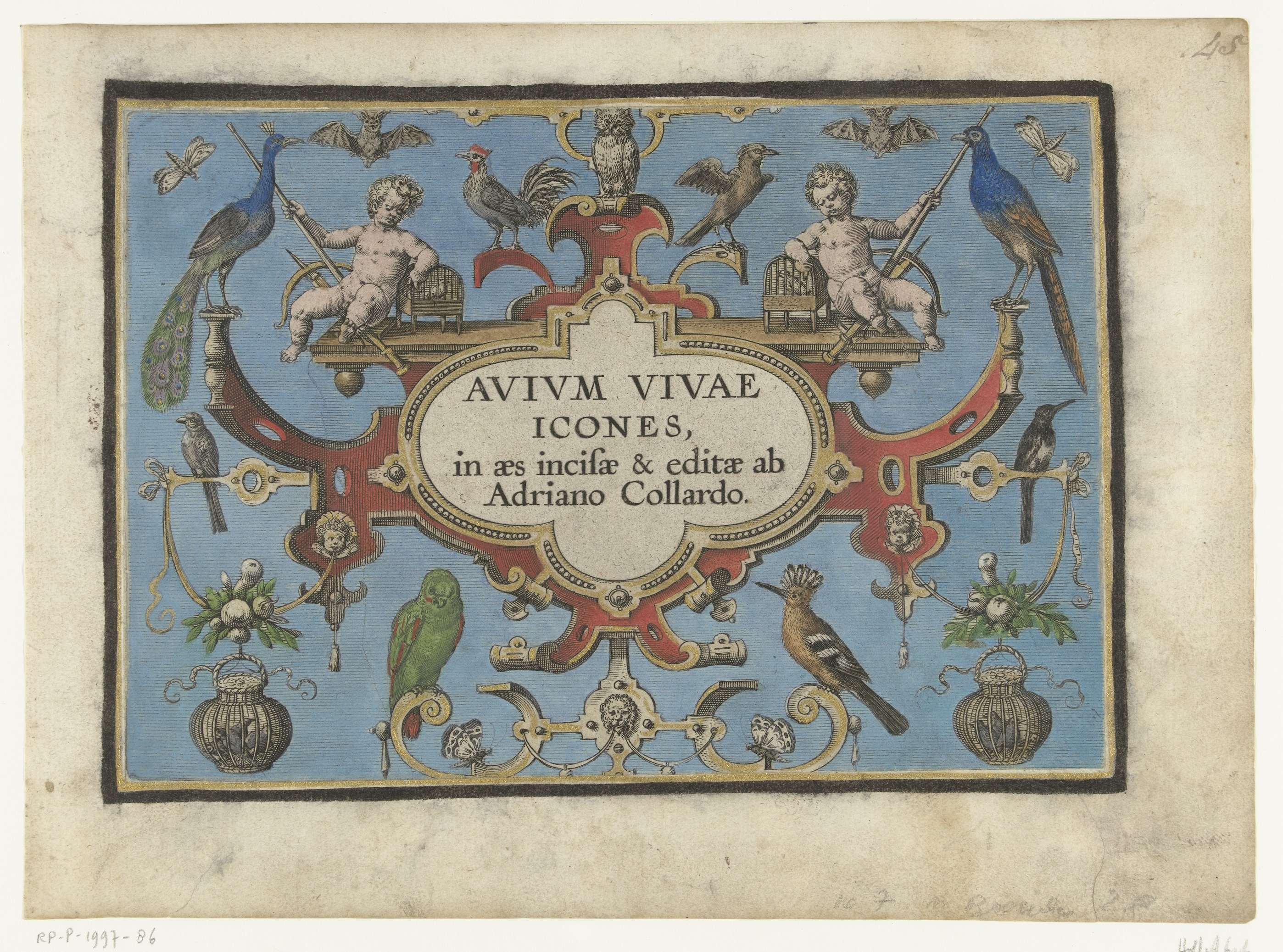 Titelblad van de serie Avium Vivae Icones in aes incisae & editae ab Adriano Collaert. Tekst in cartouche, gedecoreerd met twee putti en verschillende vogels: middenboven een uiltje, links en rechts een pauw, onderaan links een papegaai en rechts een kieviet. Met de hand ingekleurd. Ondergrond blauw; cartouche in goud en rood.