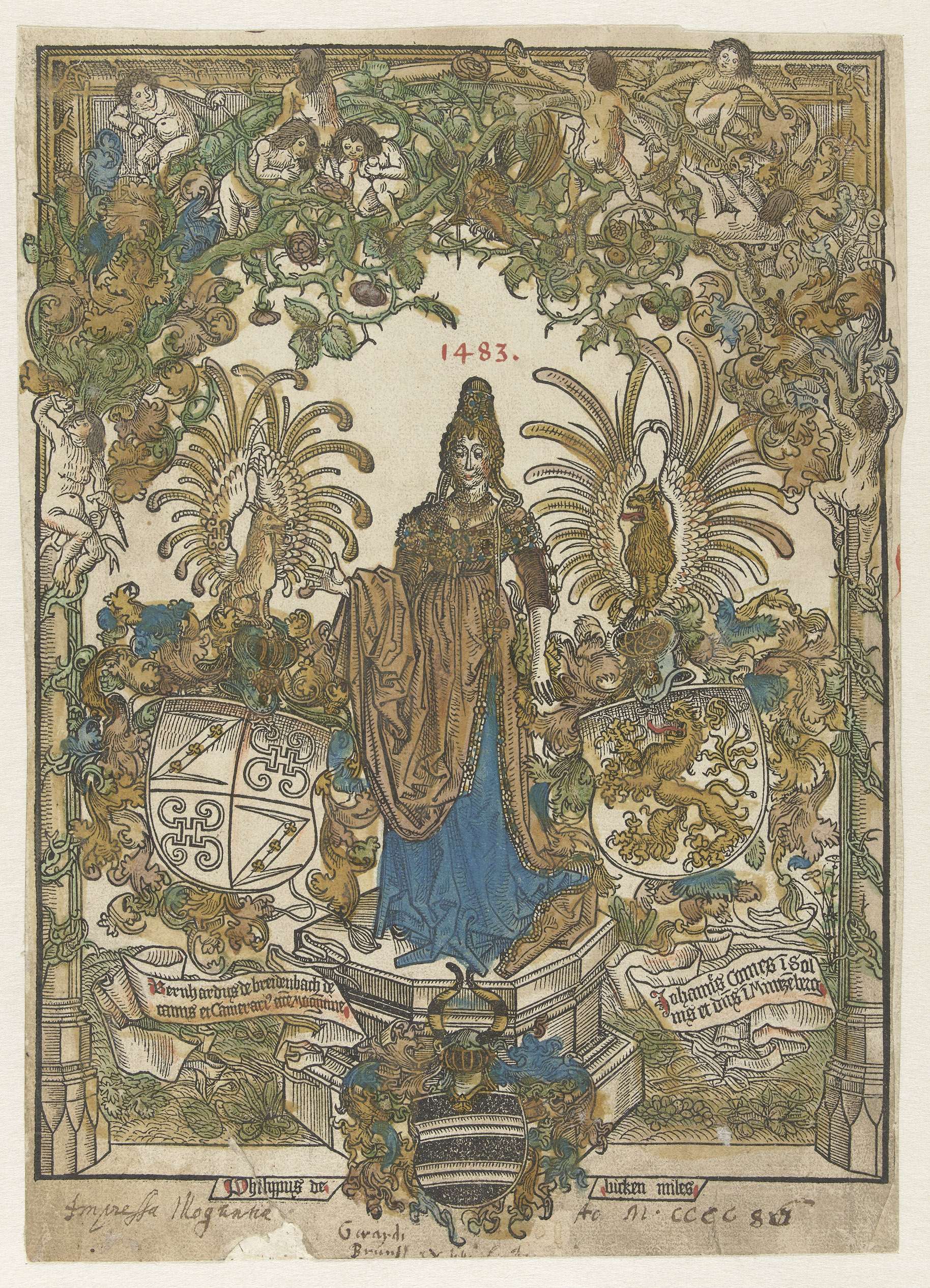 Frontispies met staande vrouw op voetstuk, geflankeerd door het wapen van Bernhard von Breydenbach en Johannes Comes (?). Voor het voetstuk staat nog een ander wapen met op twee schildjes de tekst Philypus de birken miles. De omlijsting is versierd met ornamenten van bladranken en naakte kinderfiguurtjes. Boven het hoofd van de vrouw staat het ...