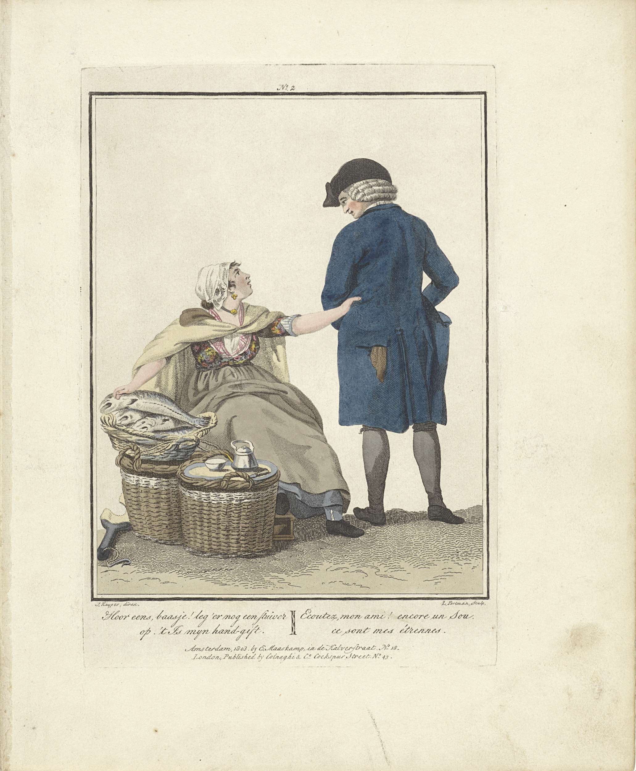 Een visverkoopster zit naast haar mand met vis. Ze klamt een heer in blauwe jas aan om iets van haar te kopen.