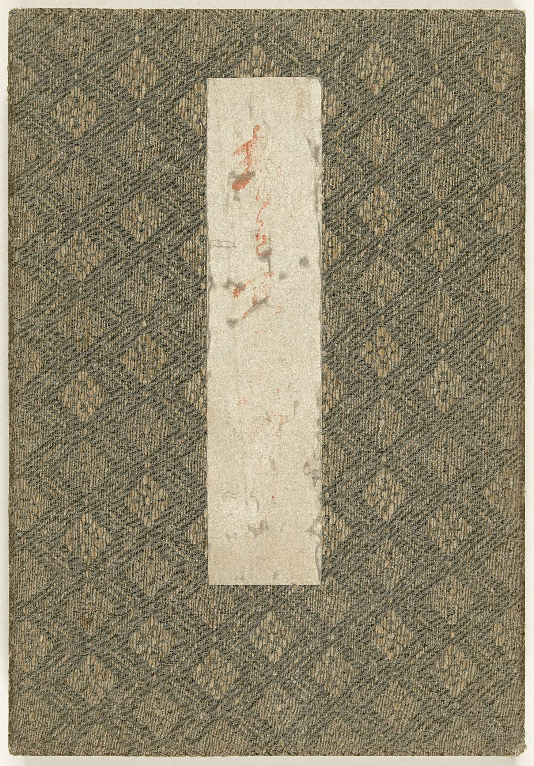 Leporelloalbum; goene brokaten kaft met middenboven titelstrook (onleesbaar); dekblad versierd met bloeiende kalebas ranken; 14 bladen: eerste prent: erotische hulpmiddelen; 10 erotische prenten met liefde bedrijvende koppels; twee prenten met tekst.