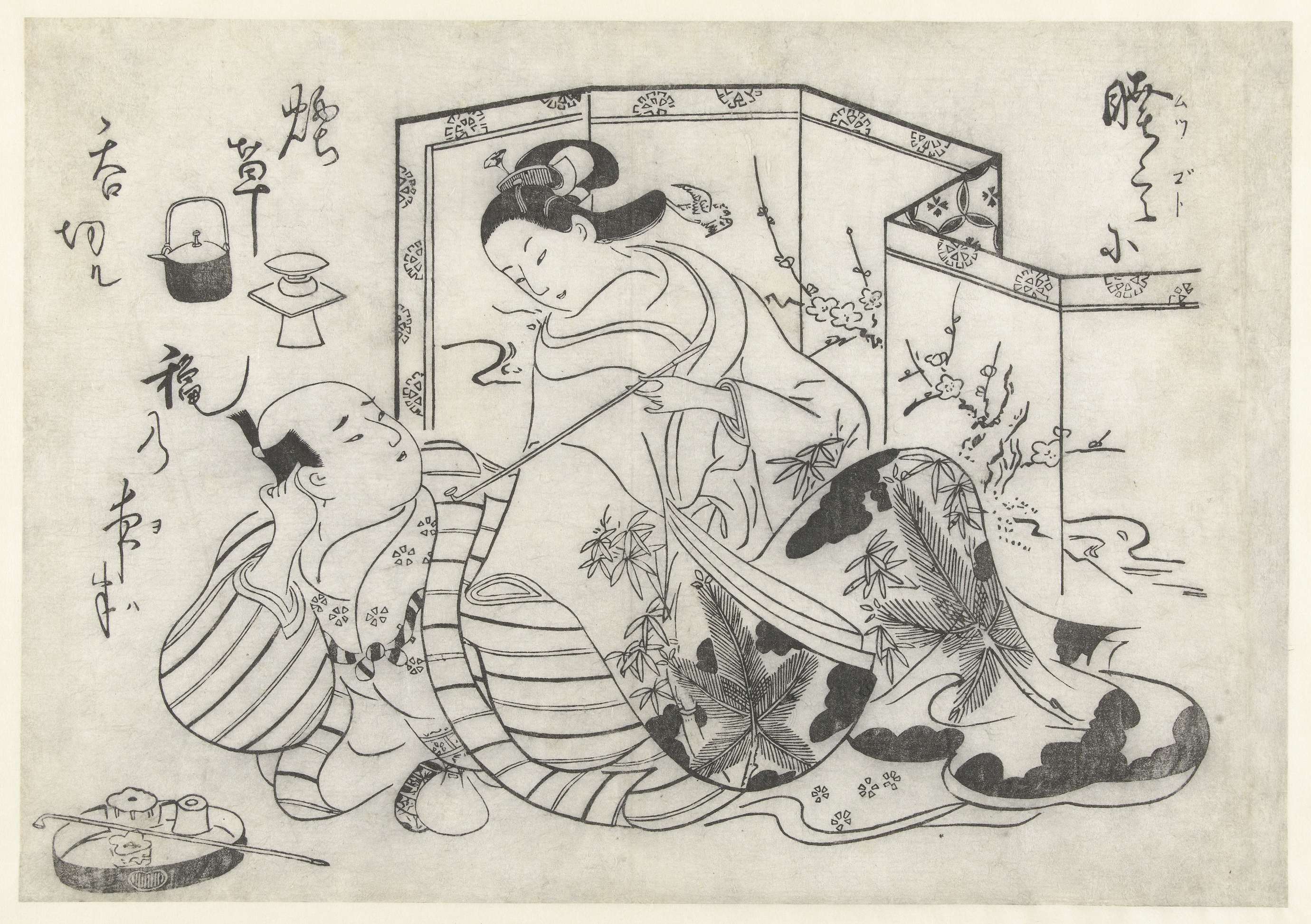 Man en vrouw voor kamerscherm waarop bloesem. De vrouw in kimono met bamboe en dennen motief, reikt de liggende man een lange pijp aan. Linksonder een tabaksset op dienblad.