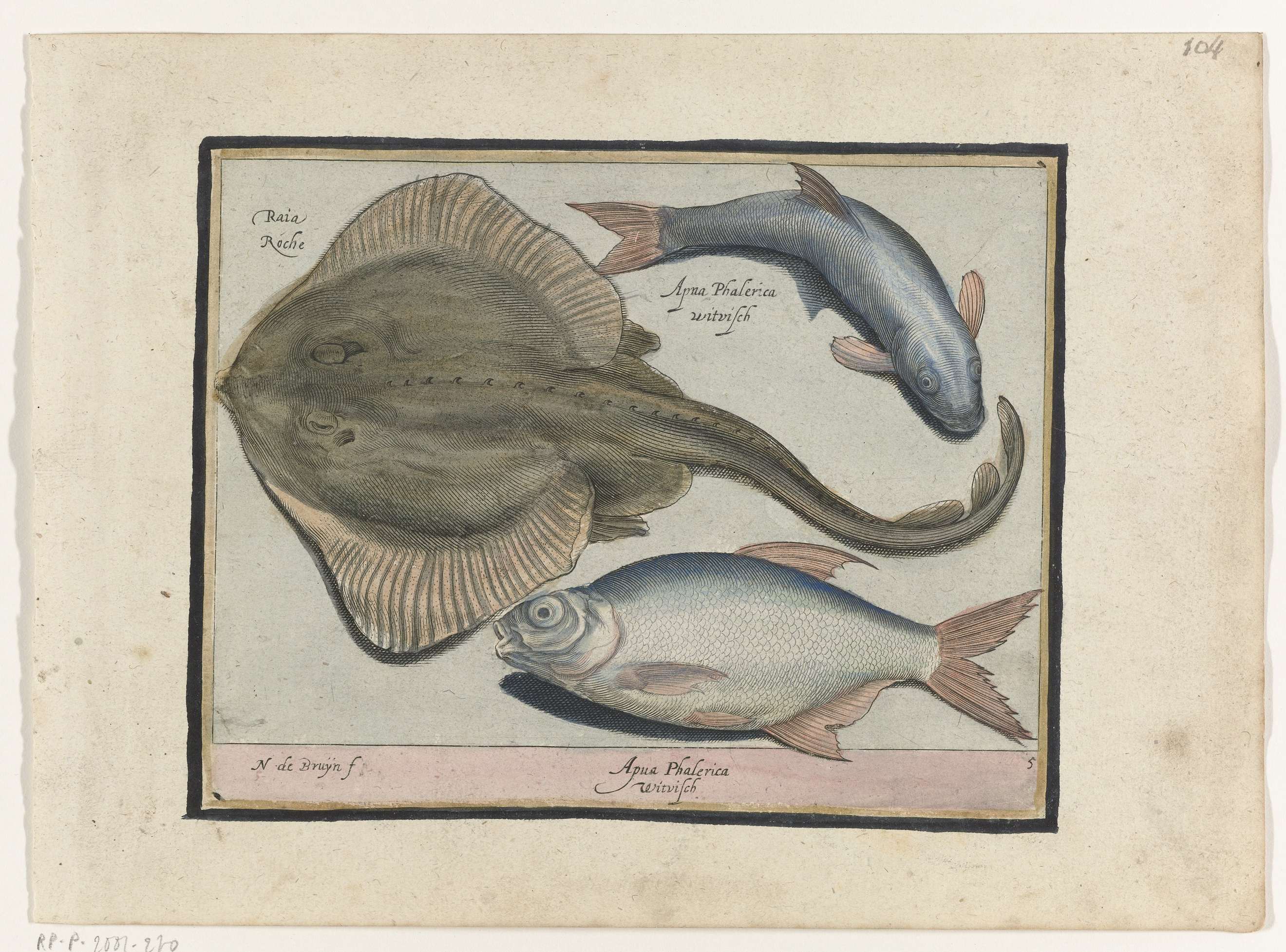 Rog, brasem en witvis, opschriften identificeren de vissen in Latijn en Nederlands.
