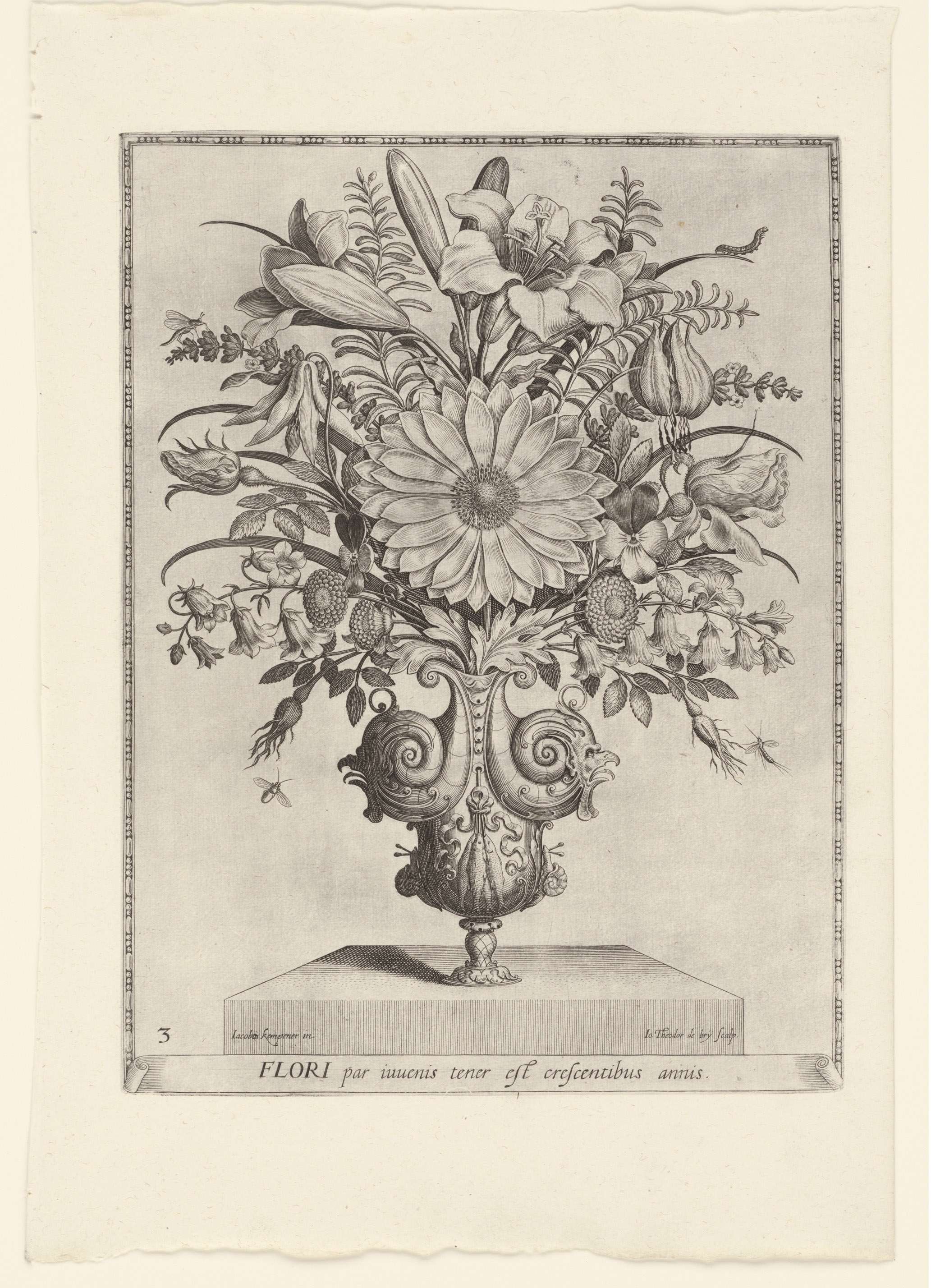 In zes rijk versierde vazen wordt een enorme variëteit aan bloemen uitgestald. De ornamentlijsten geven aan dat de prenten bedoeld waren om als schilderijen aan de muur te hangen. Daarop wijst ook het wisselend perspectief van de voetstukken. Deze afdrukken werden bij uitzondering bewaard in een prentalbum en bevinden zich daarom nog in perfecte staat.