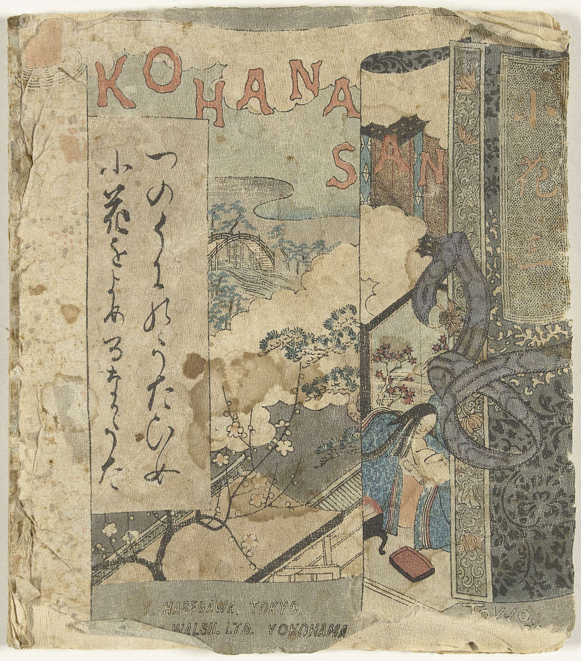Crêpe boekje met muziek en Engelse tekst over de courtisane Kohana uit Kobe; 11 bladen, genummerd: voorblad, titel en landschap; binnenkant, colofon; 1-5, muziekbalken en tekst; 6-19, tekst, landschappen en courtisanes; achterkant, volle maan en silhouet van twee kraaien op een boomtak.