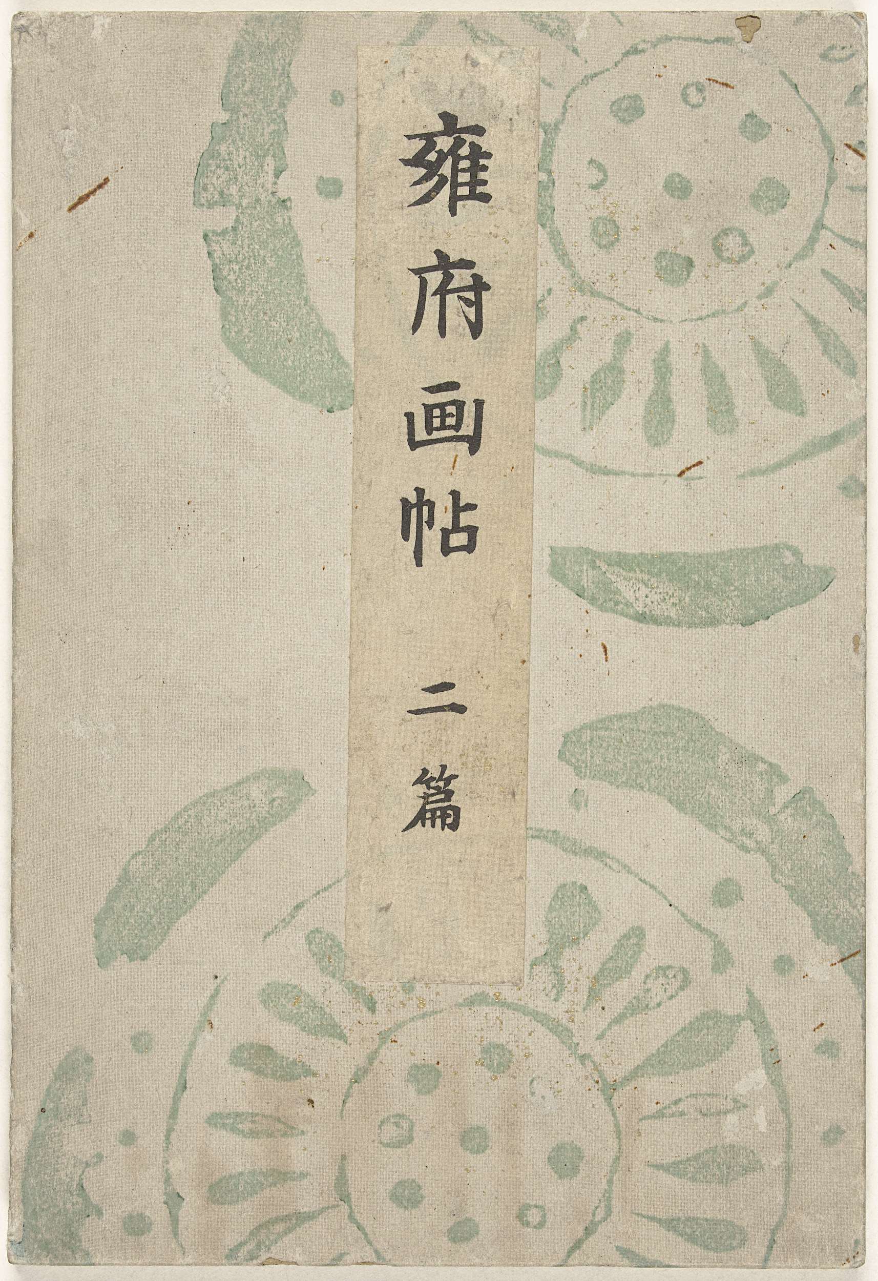 Deel twee (van drie); leporello boek; witte kaft met groen patroon; middenboven titelstrook; 13 bladen: twee pagina`s, kalligrafie tegen achtergrond met rode lijnen; twee pagina`s, inhoudsopgave; 10 landschappen; laatste pagina, colofon.