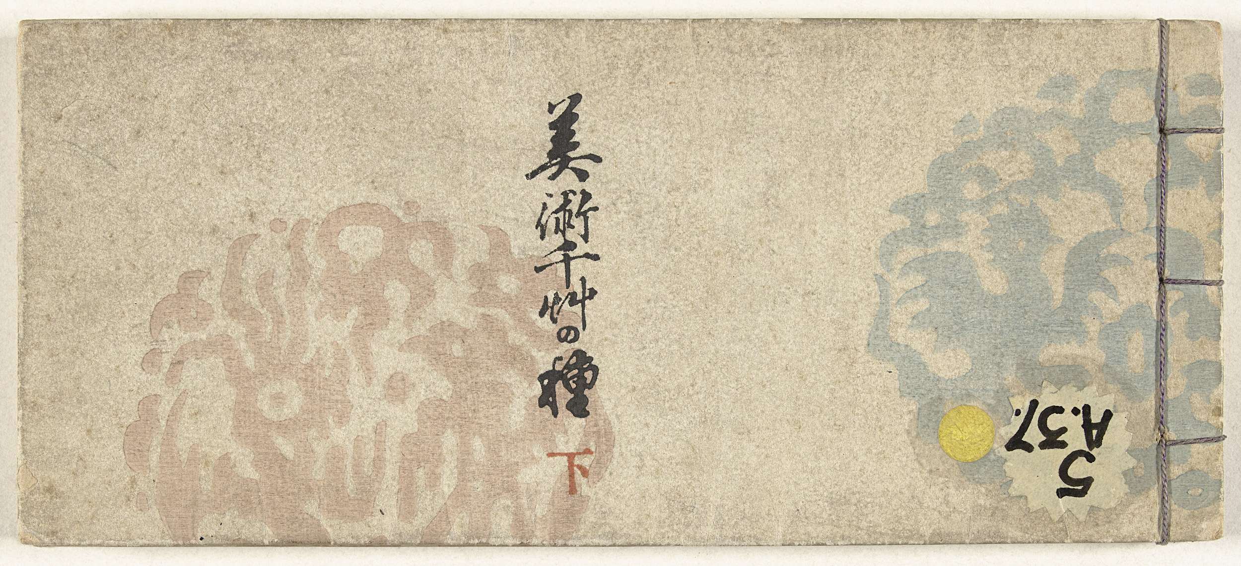 Witte kaft met blauw en roze embleem en centraal de titel; 30 bladen met diverse patroonontwerpen; laatste pagina, afbeelding van twee vogels vliegend bij pijnboom en de berg Fuji; dekblad, colofon.