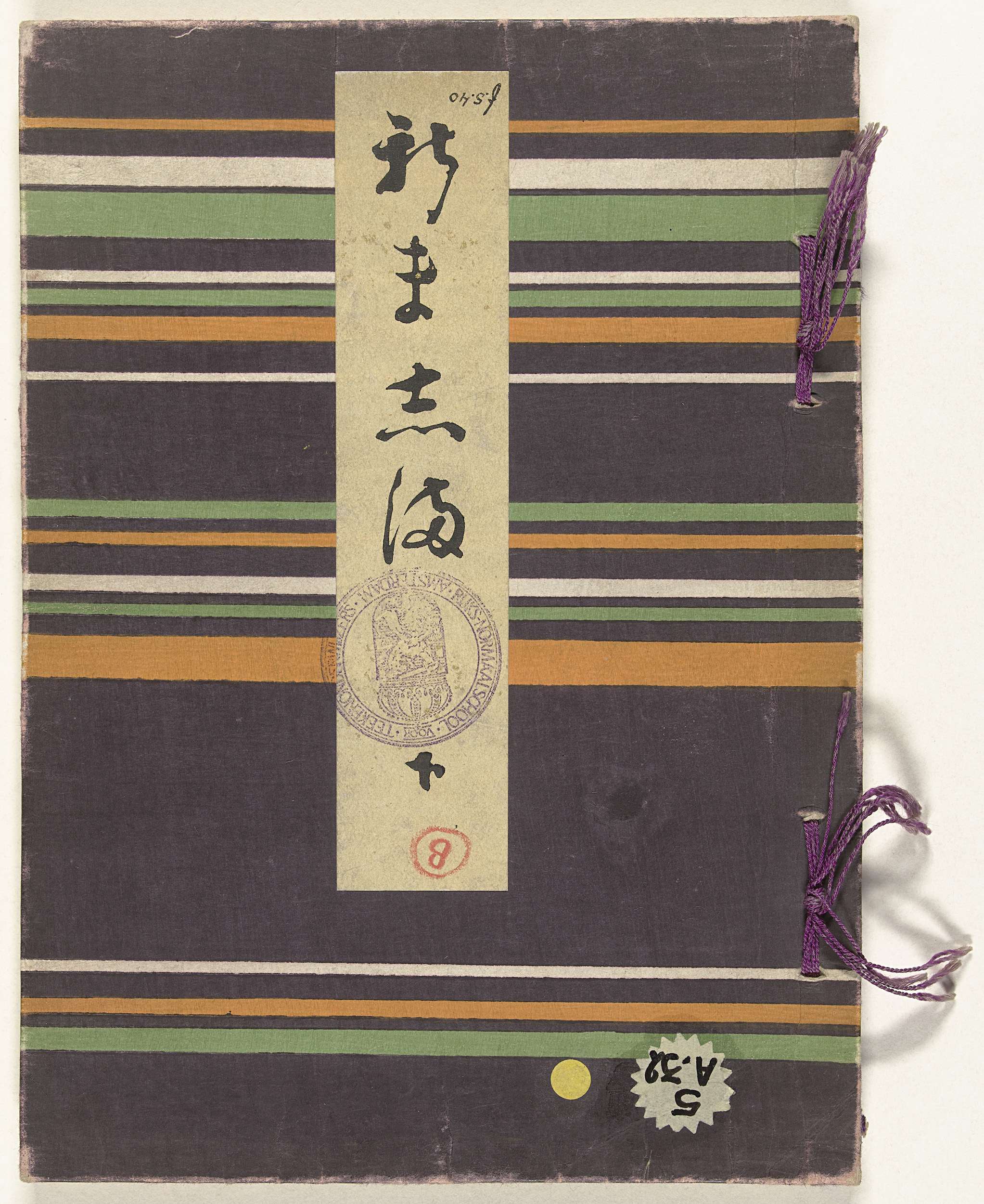 Deel twee (van twee); paarse kaft met groen-oranje-wit streeppatroon; middenboven, titelstrook; 20 bladen: verschillende met patroonontwerpen voor stof; dekblad, colofon.