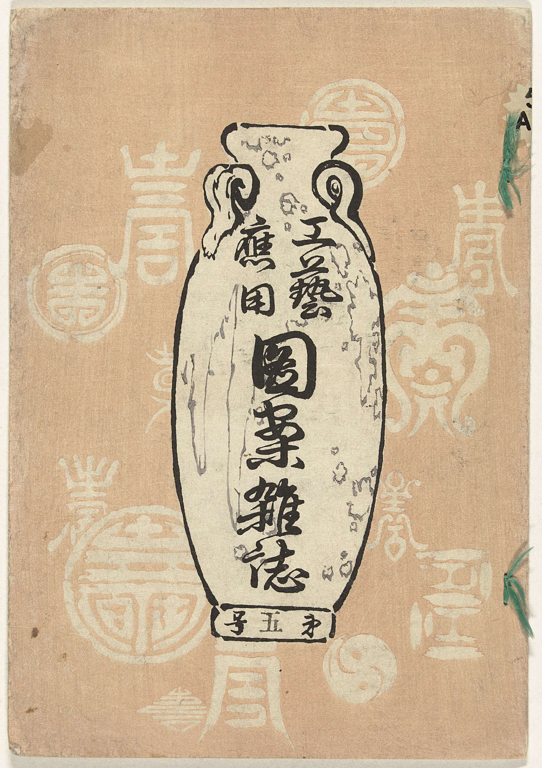 Deel vijf; roze kaft met diverse emblemen en afbeelding van een vaas waarop titel; 10 bladen: één blad, blanco; acht bladen, zwart-wit ontwerpen; laatste blad, colofon.