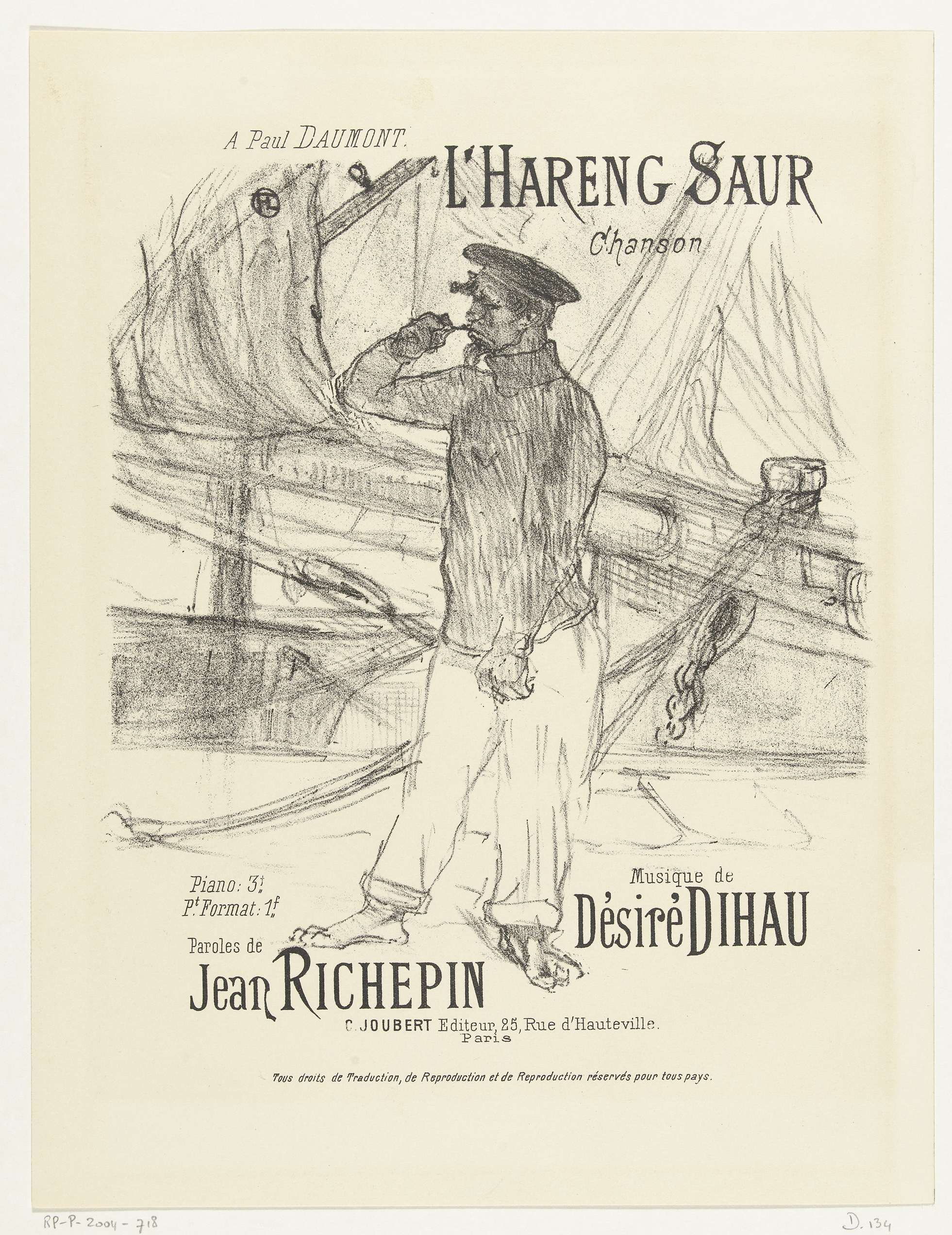 Omslag voor muziekblad met het lied L'Hareng saur. Een matroos staat op een kade waar zeilschepen voor anker liggen. Waarschijnlijk eet hij een haring (titel lied) want hij houdt iets vast met zijn hand vlakbij zijn mond, mogelijk de staart van een vis. De omslagen voor de muziekbladen waren zo populair dat de serie in ...