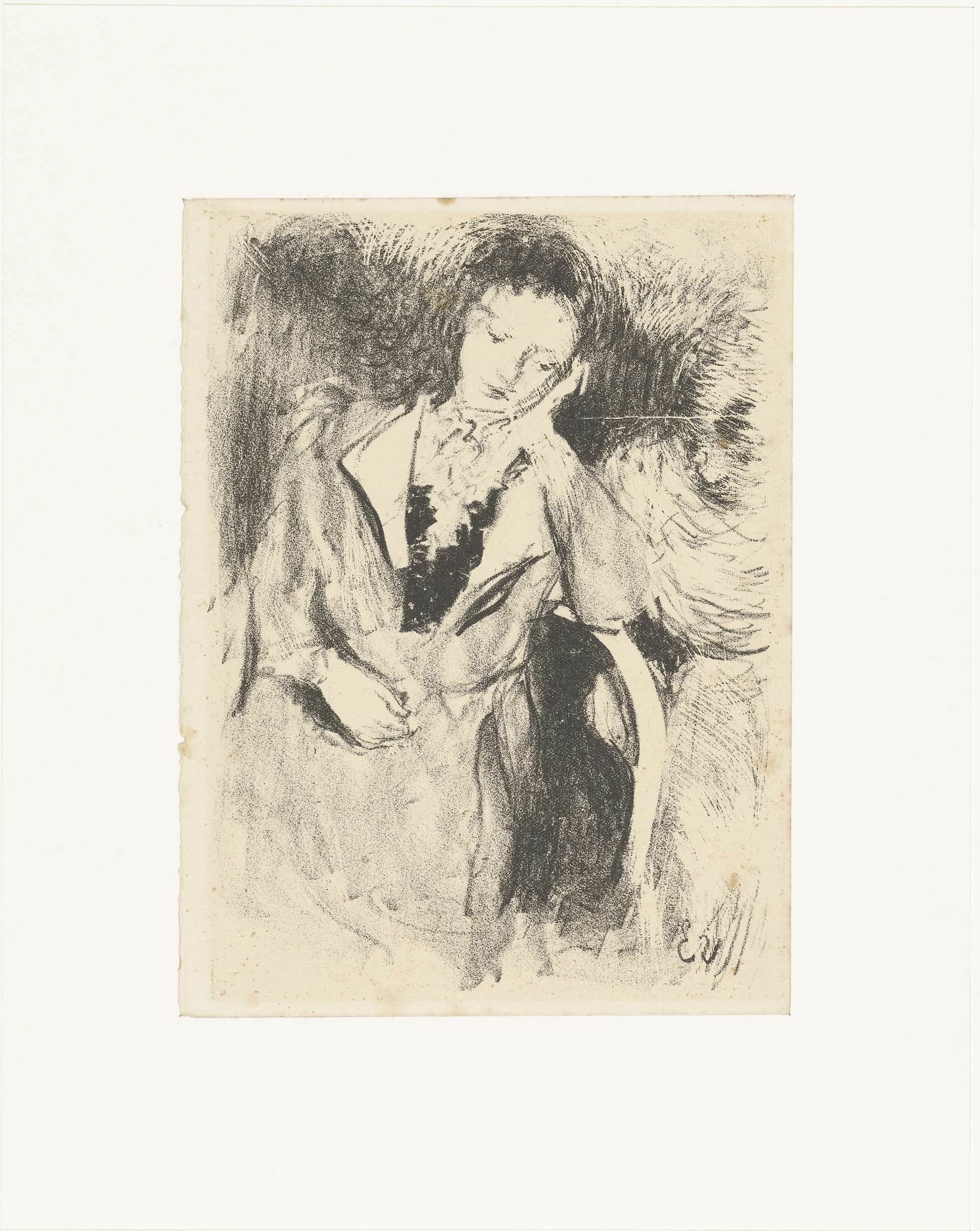 Vrouw zit op een stoel en ondersteunt haar hoofd met een arm die op de rugleuning rust. Ze heeft haar blik naar beneden gericht waardoor ze in gedachten verzonken lijkt. Naast haar staat of zit nog een figuur maar deze komt niet duidelijk naar voren in de compositie.