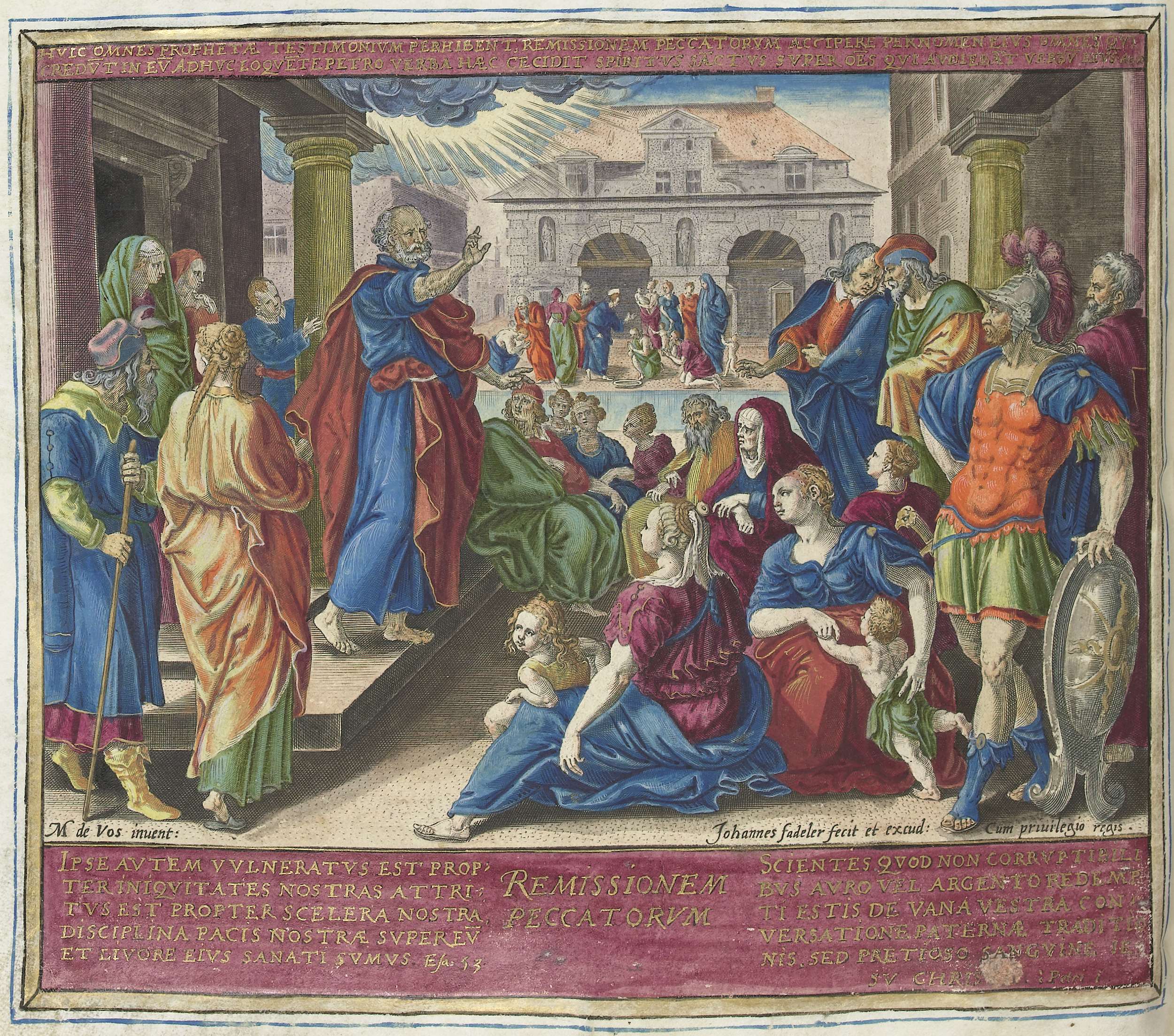 Illustratie van het tiende geloofsartikel (de vergeving van zonden) van de apostolische geloofsbelijdenis. De apostel Petrus spreekt een menigte gelovigen toe over de vergeving van zonden. Een licht verschijnt in de lucht: de Heilige Geest daalt neer op alle toehoorders. Op de achtergrond worden gelovigen gedoopt. Boven de voorstelling een verwijzing naar de Bijbeltekst in ...