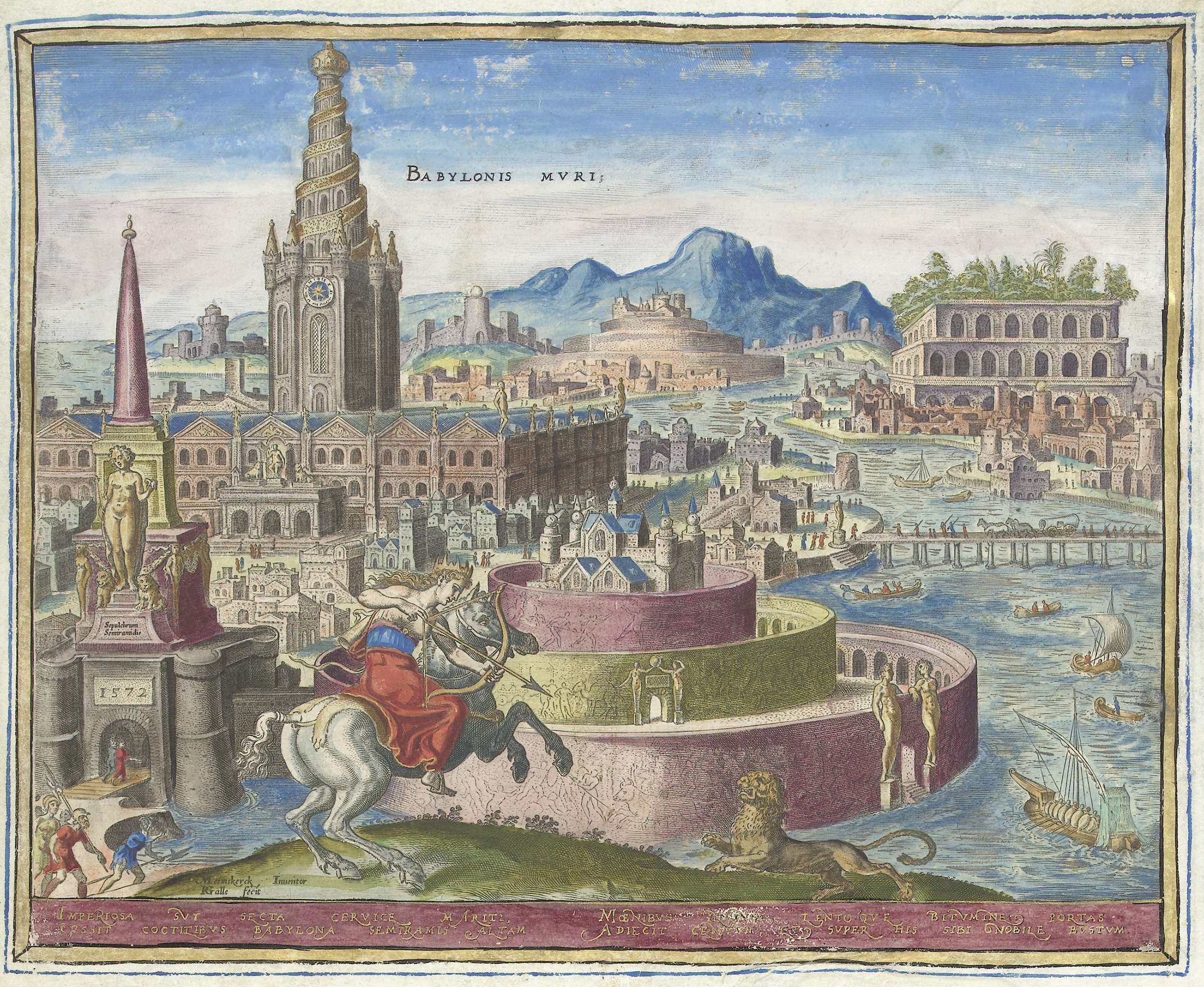 De muren van Babylon, in cirkels gebouwd. Linksachter een groot gebouw met toren. Op de voorgrond koningin Semiramis als een amazone te paard. Gewapend met pijl en boog is zij is in gevecht met een leeuw. In de achtergrond de hangende tuinen van Babylon: een botanisch en architectonisch kunstwerk. Onder de voorstelling een vers in ...