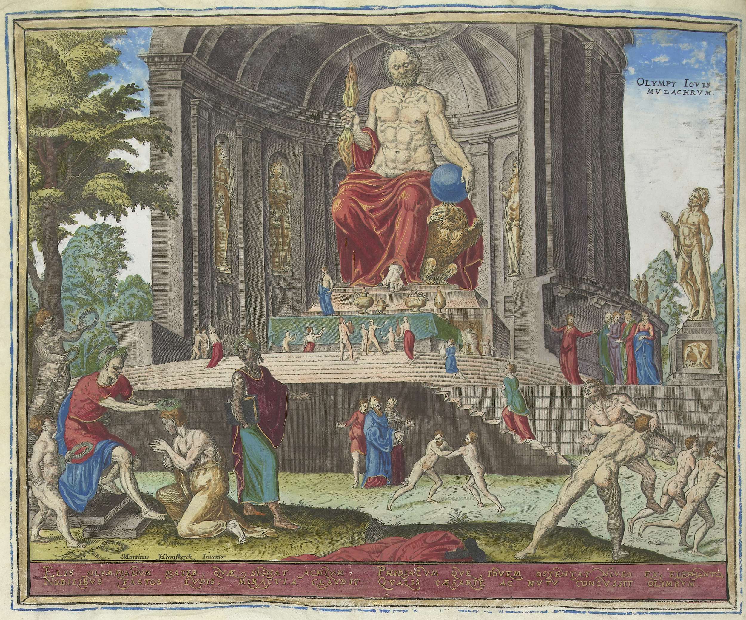 Het beeld van Zeus bevond zich binnen in de Dorische tempel van Olympia, op de Griekse Peloponnesus. Het werd omstreeks 433 v. Chr. gemaakt door de Atheense beeldhouwer Phidias. Rechts van de tempel een beeld van Hercules. Op de trappen voor de tempel mensen die het beeld van Zeus aanbidden. Op de voorgrond rechts Olympische ...