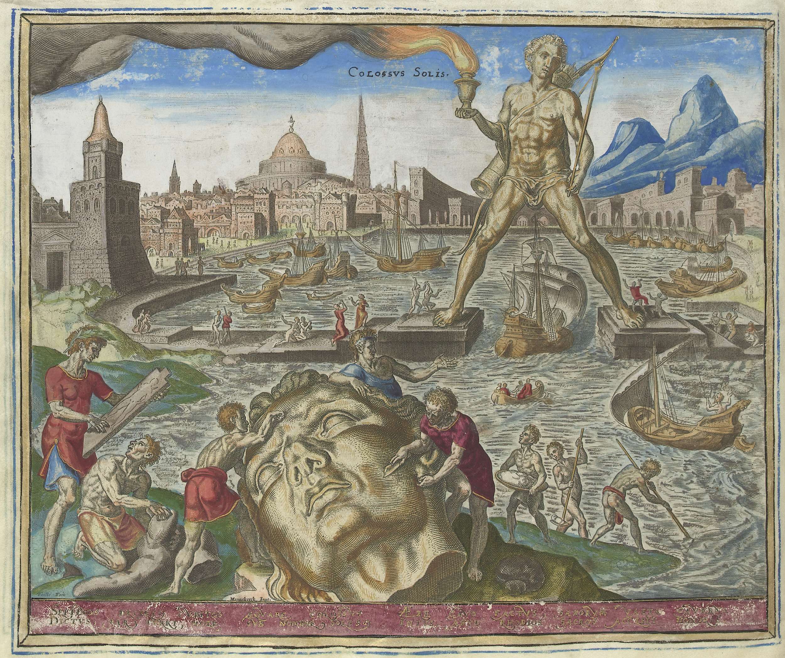 Het bronzen beeld van Helios, ook wel de Kolos van Rhodos genoemd, staat wijdbeens boven de haven, terwijl de schepen onder zijn benen doorvaren. Aan zijn voeten mensen in aanbiddende houding. Na de aardbeving ca. 227 v. Chr. is het beeld vernield. Op de voorgrond wordt de enorme kop van het beeld schoongemaakt. Een man ...