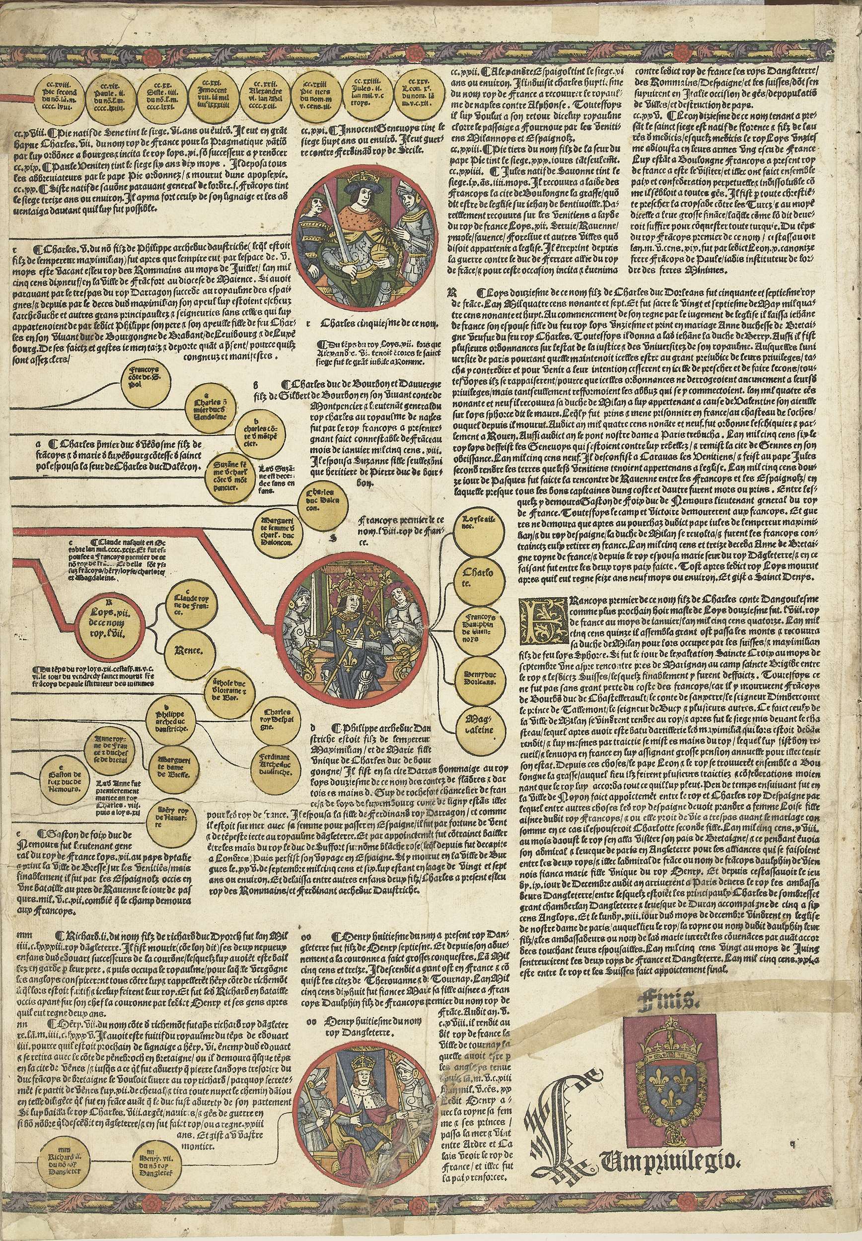 Blad 14 verso van een wereldkroniek. Tekst in boekdruk in het Frans. Midden boven een ronde voorstelling van keizer Karel V van Habsburg. Midden een ronde voorstelling van Frans I van Valois-Angoulême, koning van Frankrijk. Midden onder een ronde voorstelling van koning Hendrik VIII, koning van Engeland en Ierland. De ronde voorstellingen zijn verbonden met ...