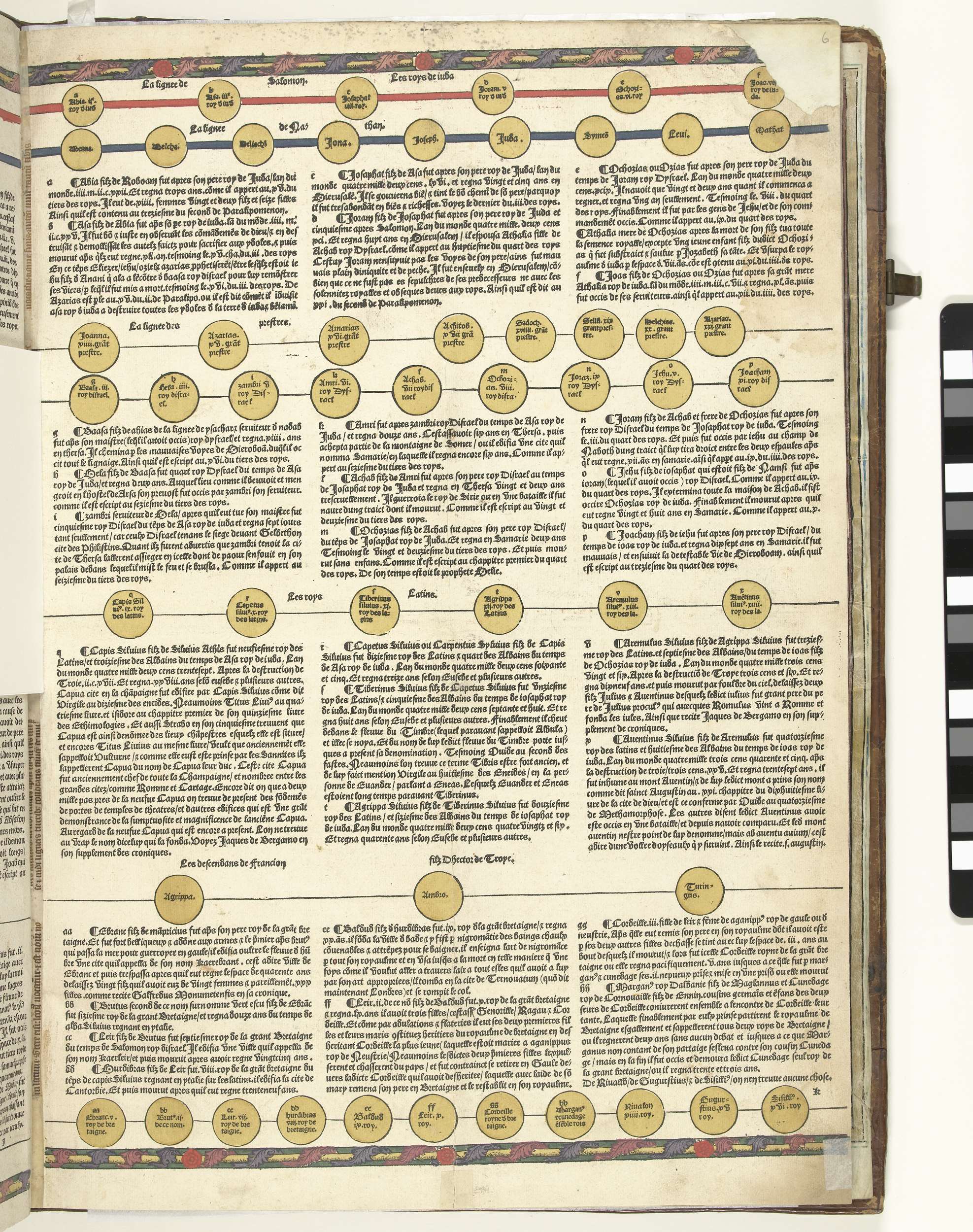 Blad 6 recto van een wereldkroniek. Tekst in boekdruk in het Frans in drie kolommen. Ronde cirkels zijn gevuld met namen: deze vormen samen een schematische weergave van genealogie en vorstenopvolging, die zich uitstrekt over meerdere bladzijden van de kroniek.