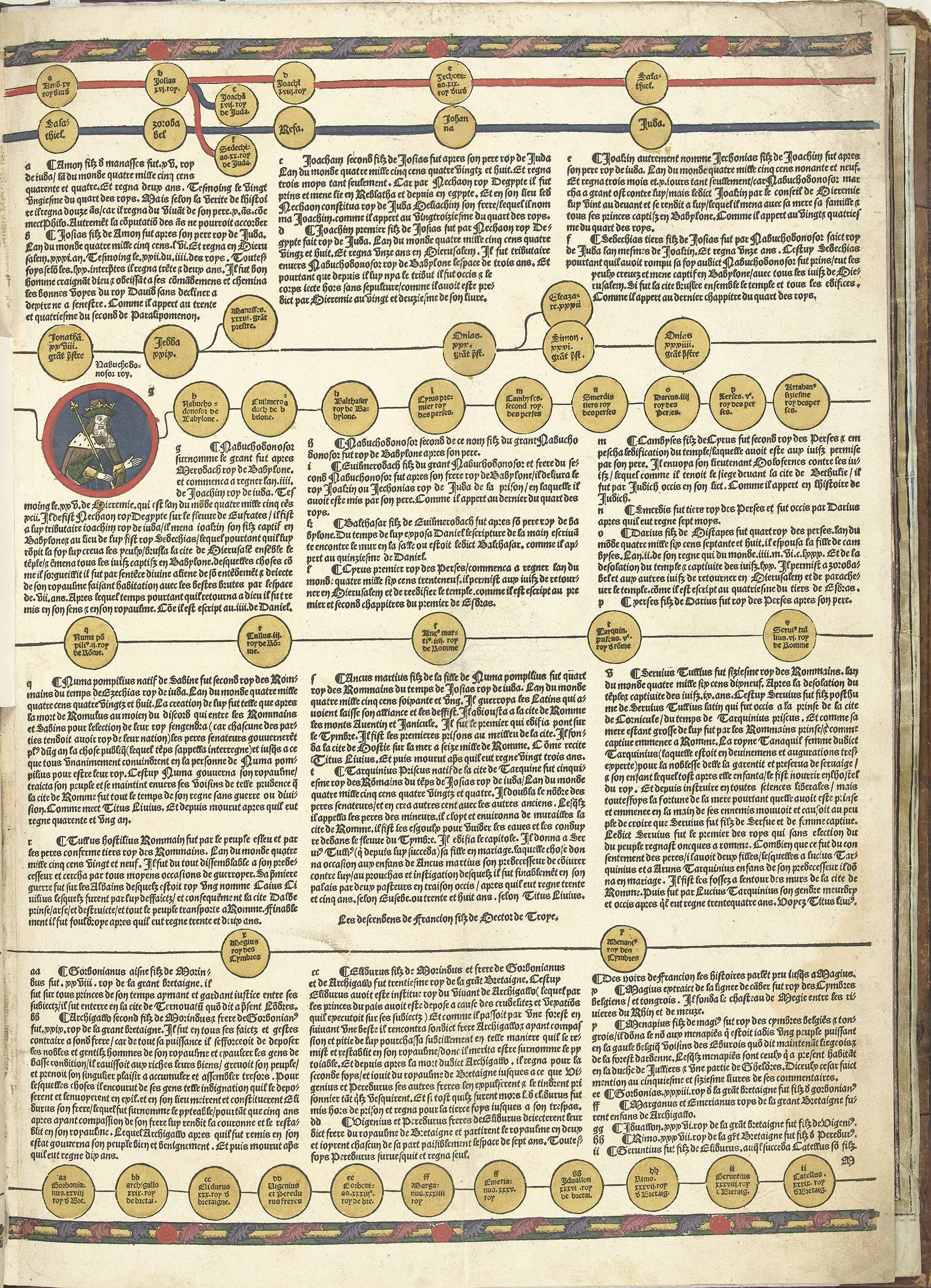 Blad 7 recto van een wereldkroniek. Tekst in boekdruk in het Frans in drie kolommen. Links midden een ronde voorstelling van koning Nebukadnessar van Babel. De ronde voorstelling is verbonden met andere cirkels die gevuld zijn met namen: deze vormen samen een schematische weergave van genealogie en vorstenopvolging, die zich uitstrekt over meerdere bladzijden van ...